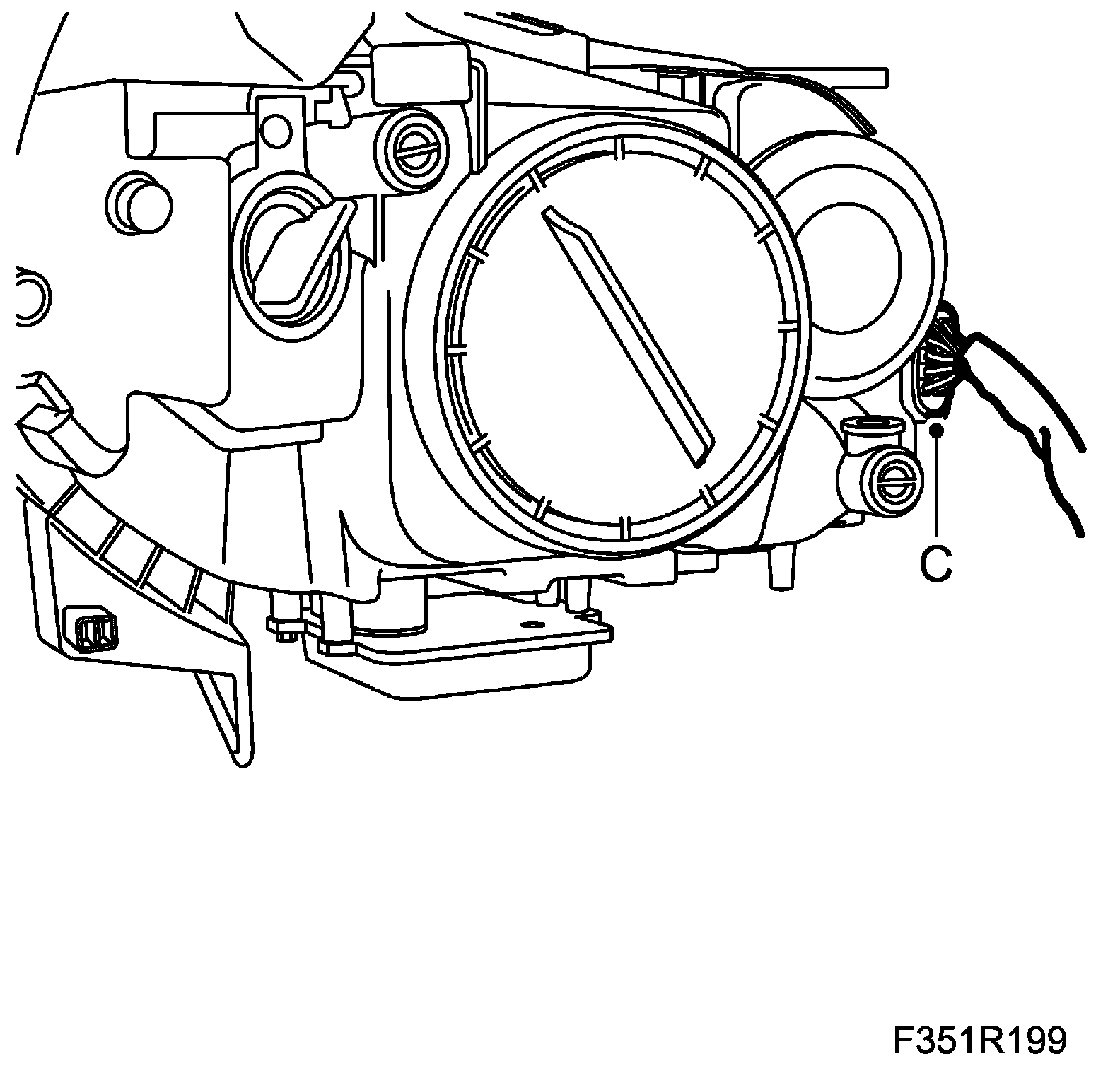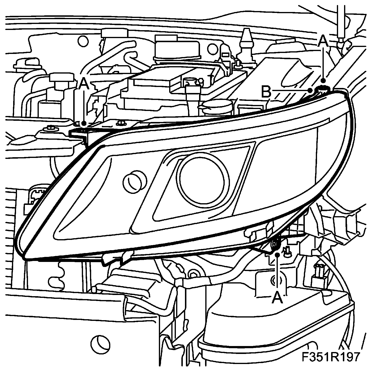 ^ Release the headlamp from the upper, rear mounting (B), lift it out a bit and detach the connector (C).
