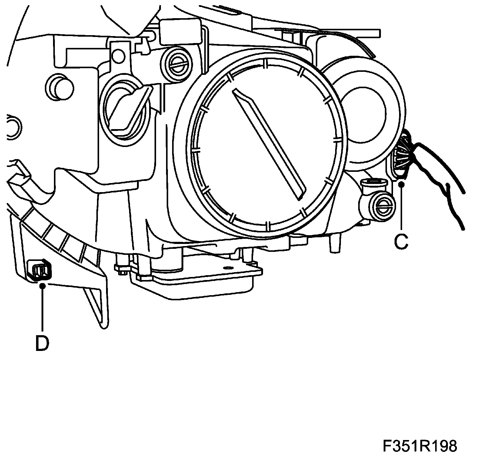 ^ Attach the connector (C), angle in the headlamp and position it correctly, guiding it using the guide pin (D). Snap it into place in the rear, upper mounting (B).