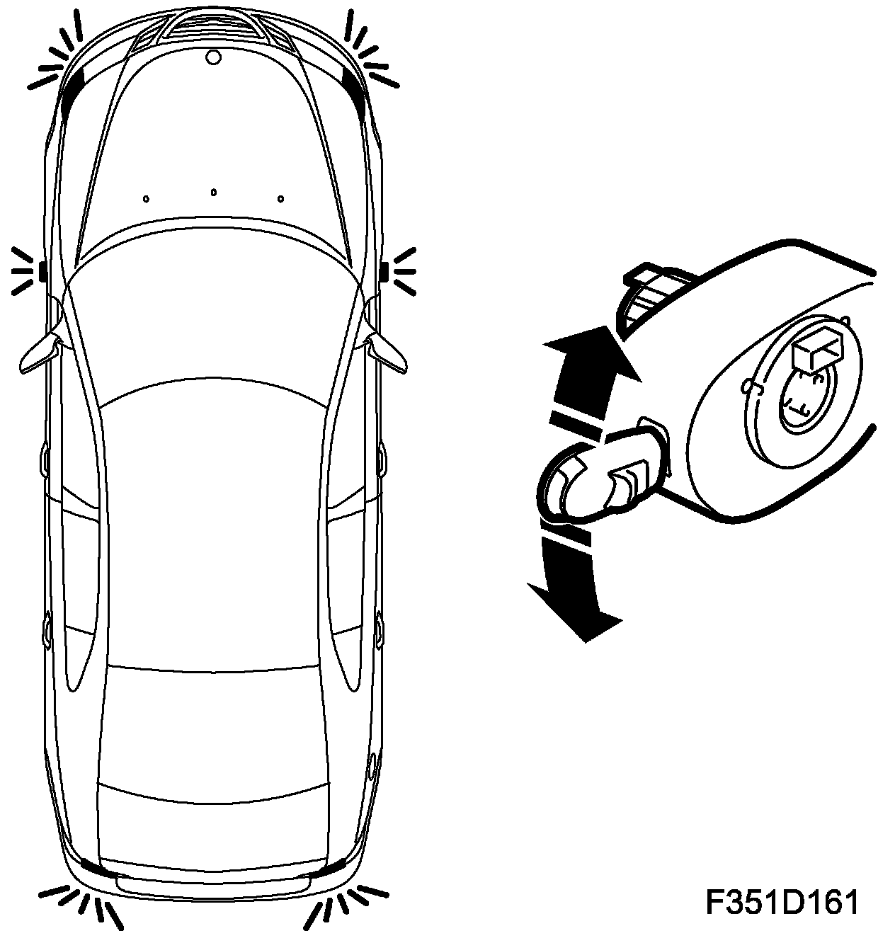 The car's direction indicators can be activated when the ignition switch is in the ON position. The direction indicator switch is fitted in the CIM (703). When the direction indicator stalk is moved up or down the CIM (703) sends the bus message "Direction indicator stalk active RIGHT" or "Direction indicator stalk active LEFT" respectively. The bus message is used by the BCM (707) which determines the rate of flashing. The BCM (707) sends bus messages which are used to control both the UEC (342) and the REC (701), but also for the light and acoustic indicator in the MIU (540).