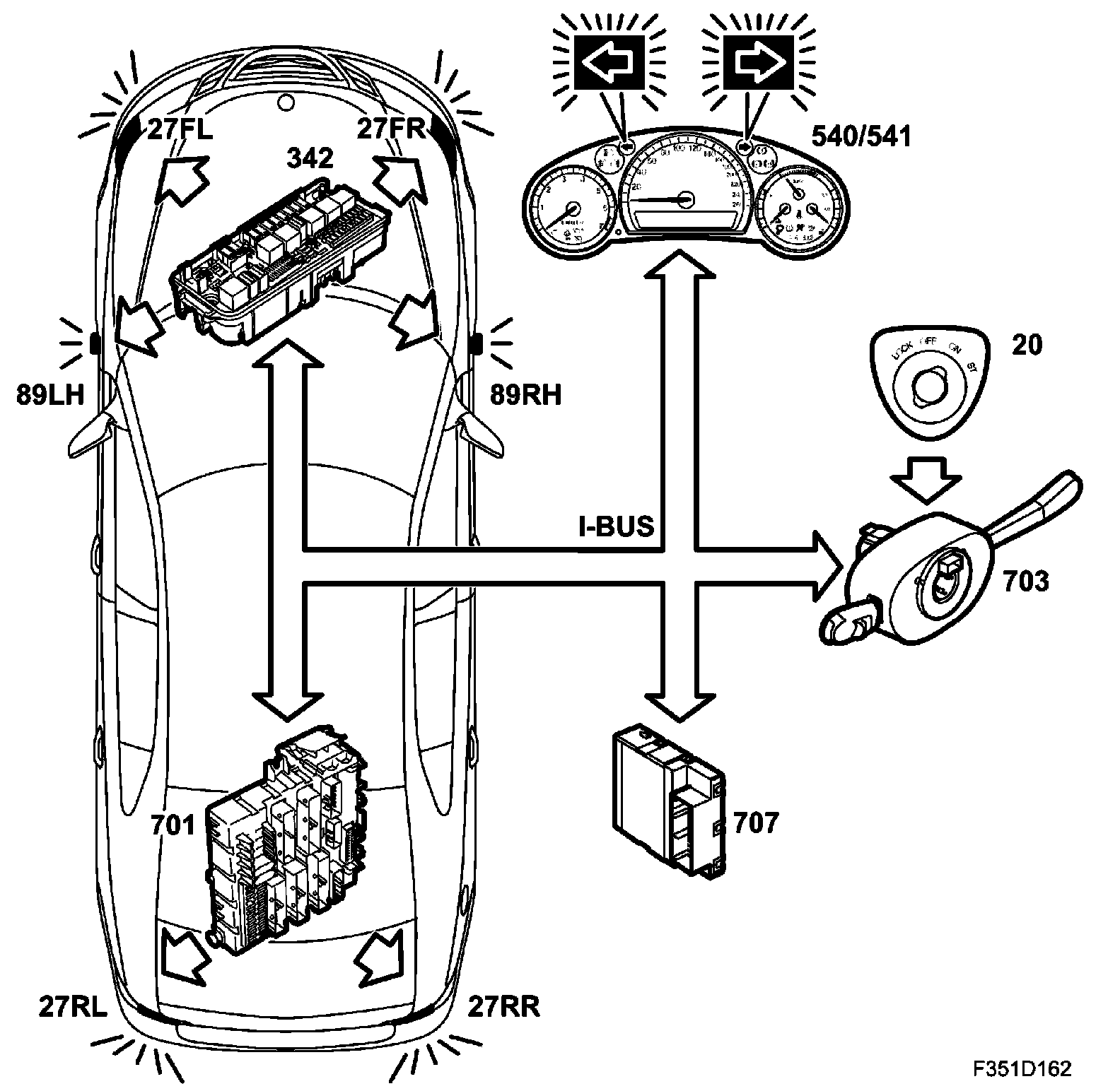 The direction indicators are located in the headlamps, the front wings and the rear light clusters. Upon activation, CIM sends a message to the fuse boxes in the engine bay and luggage compartment, which control the direction indicators in the front and rear, respectively. Flash frequency is 90 flashes per minute. In the event of filament breakage, flash frequency is increased to 180 flashes per minute and a warning message is displayed in SID.