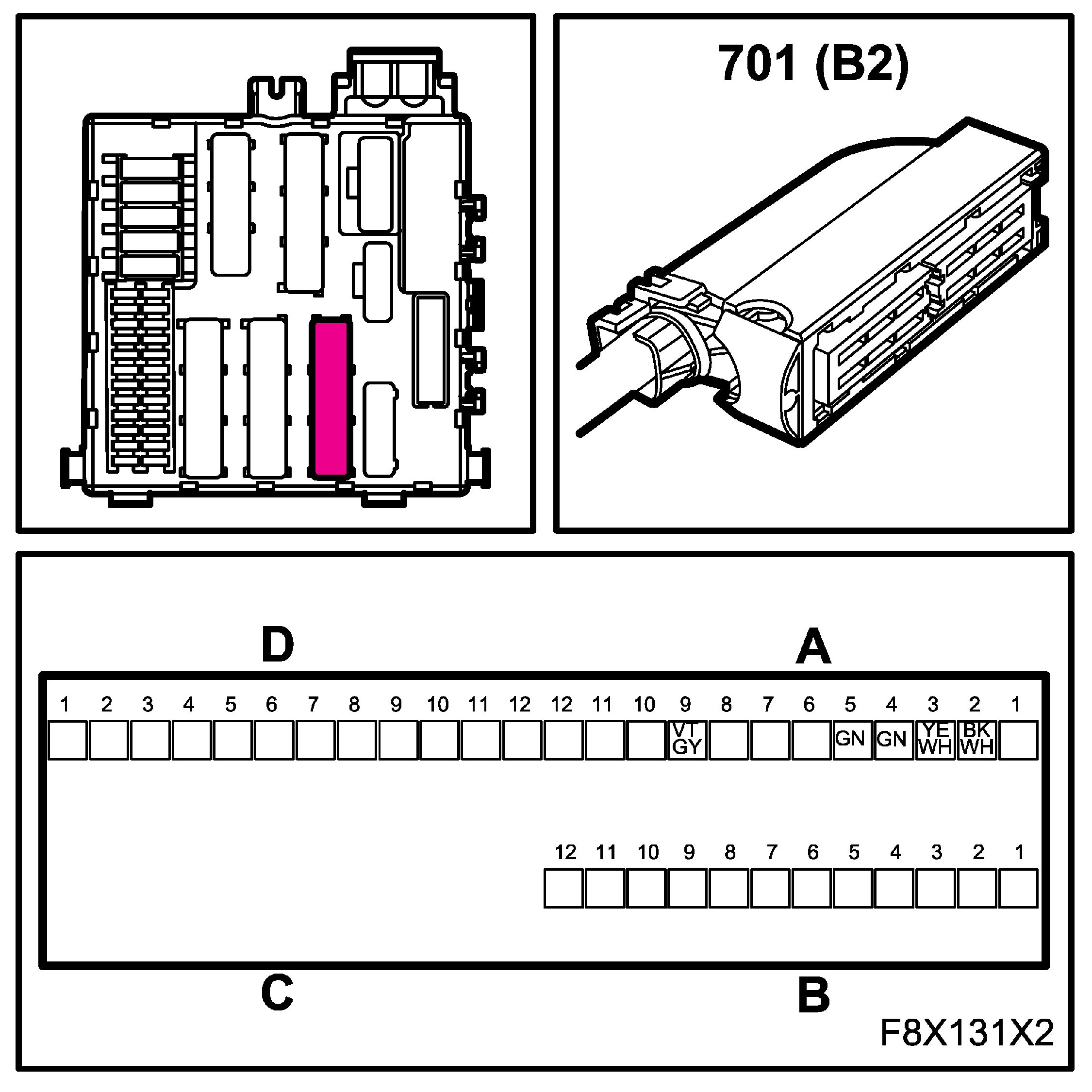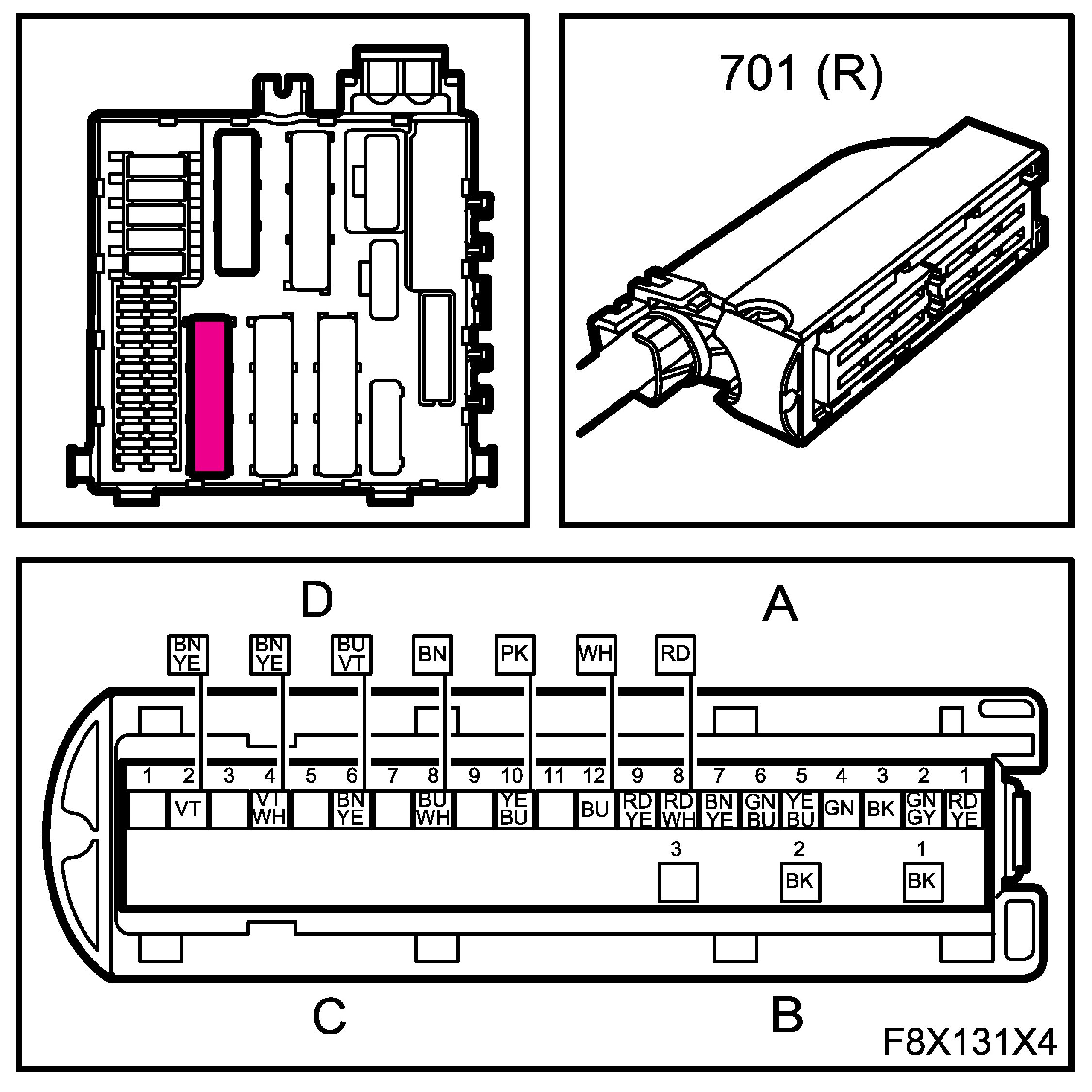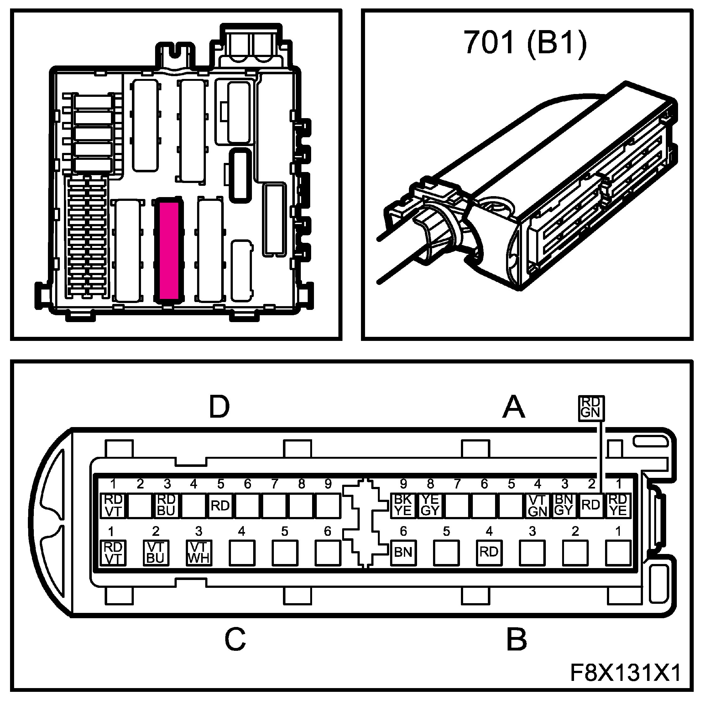 The connectors for the main and rear wiring harnesses each comprise four subconnectors, which are named A, B, C and D in the wiring diagrams, for example B1-B.