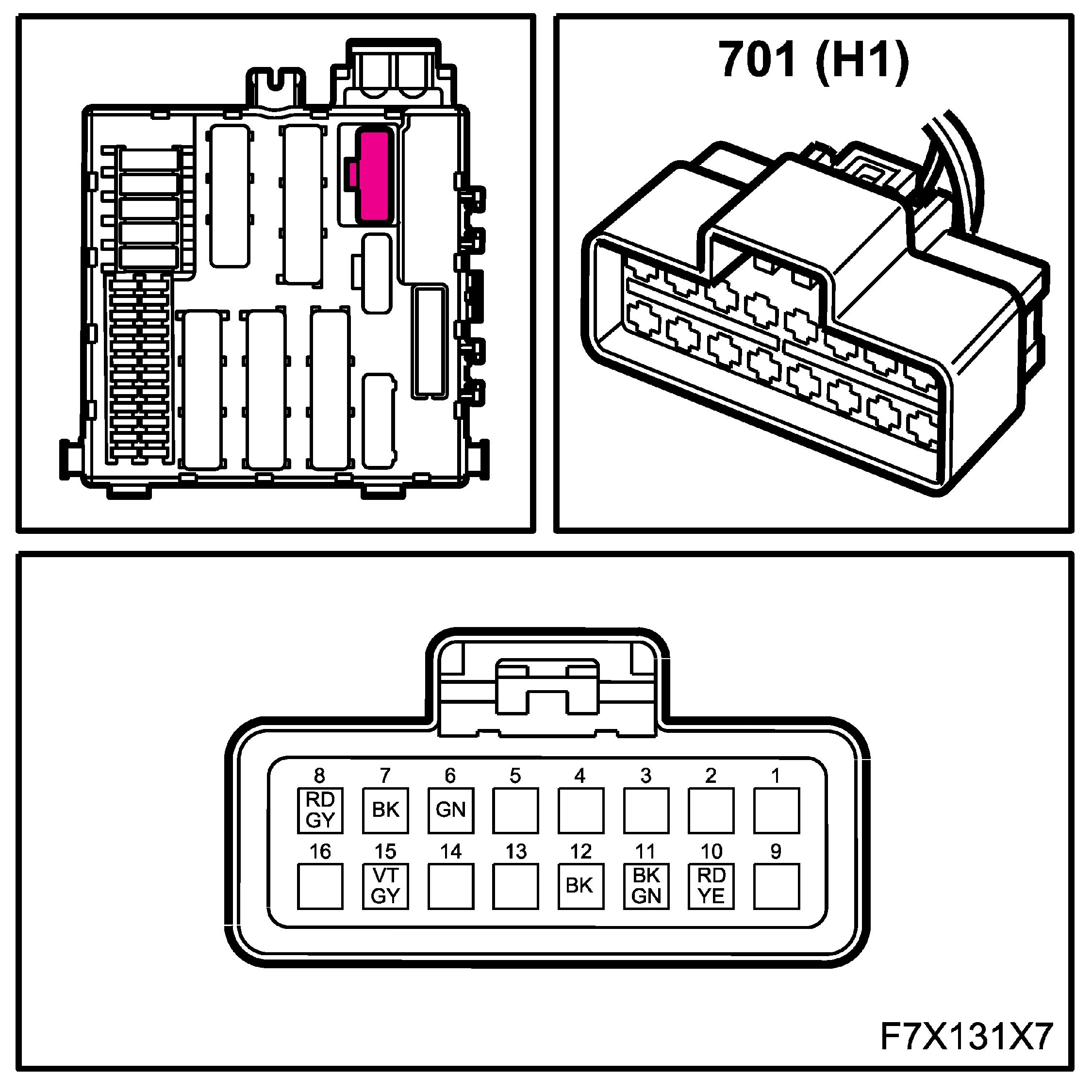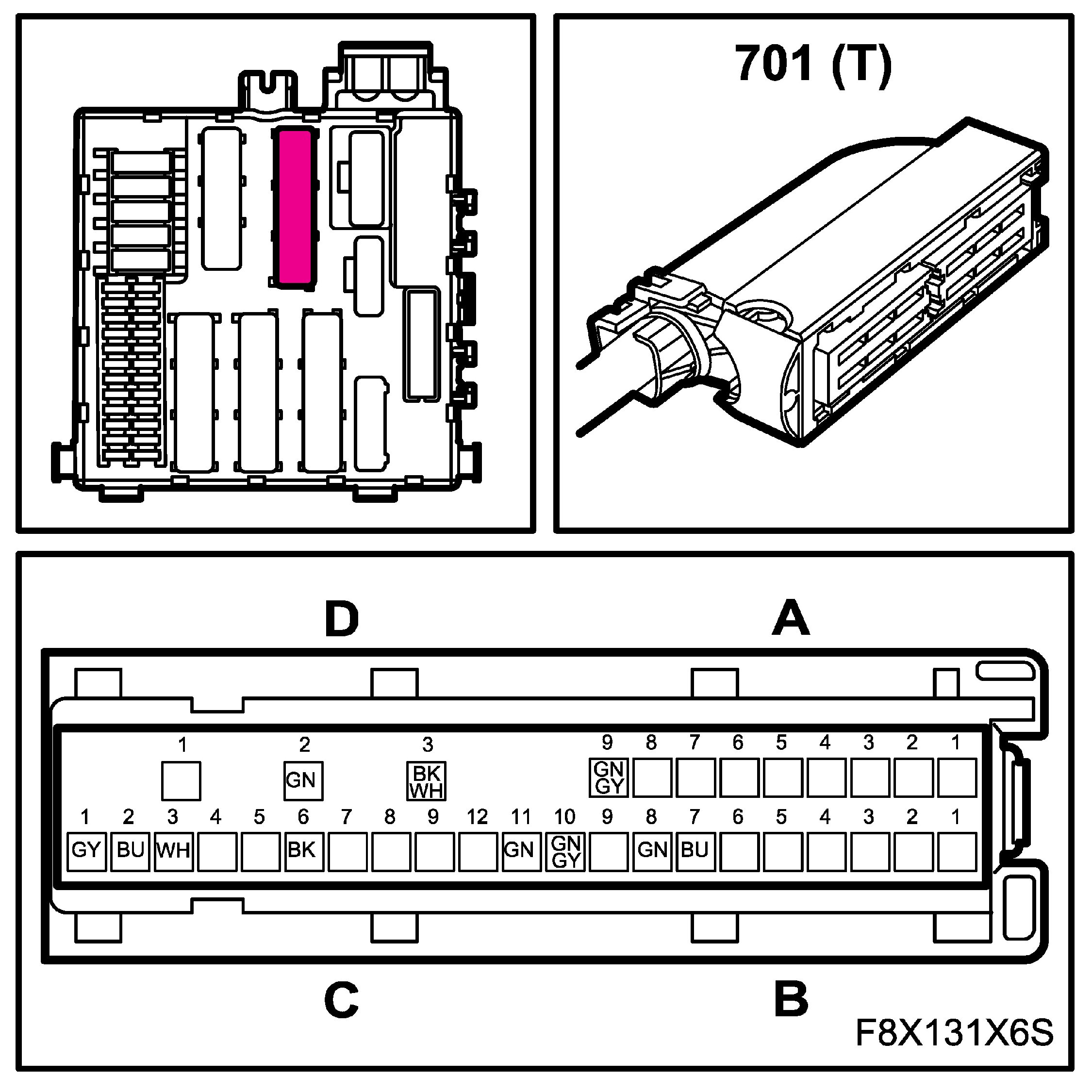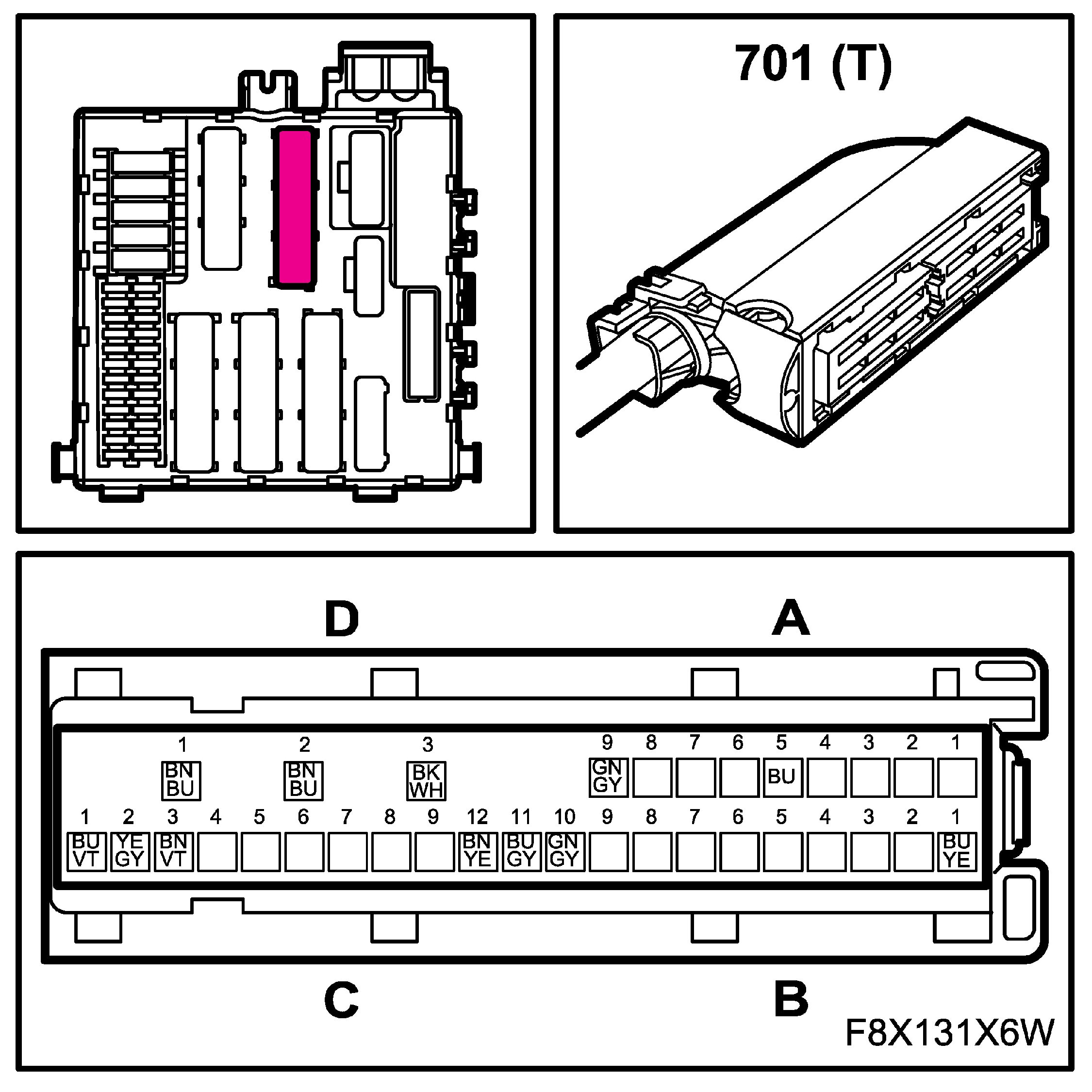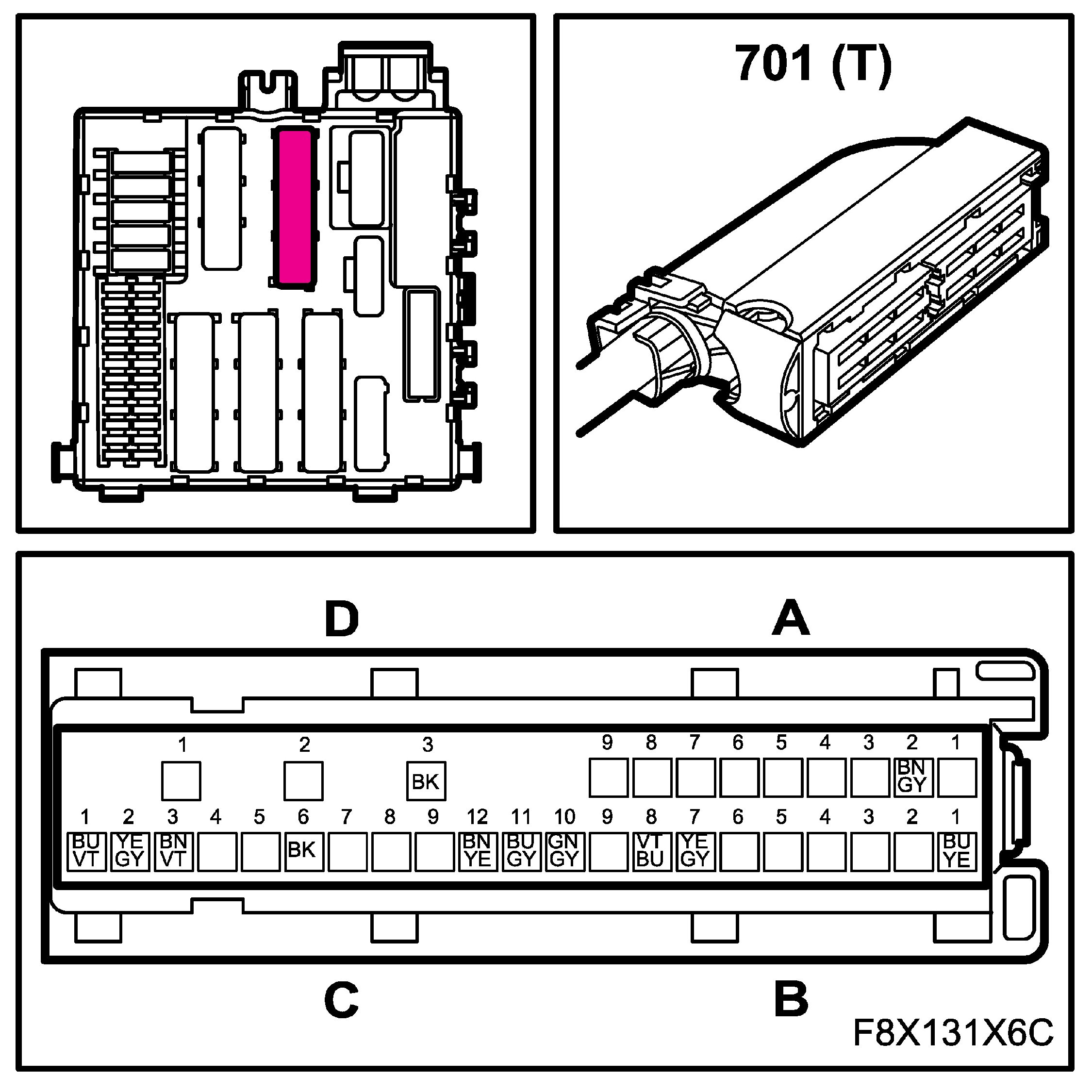 The connectors for the main and rear wiring harnesses each comprise four subconnectors, which are named A, B, C and D in the wiring diagrams, for example B1-B.