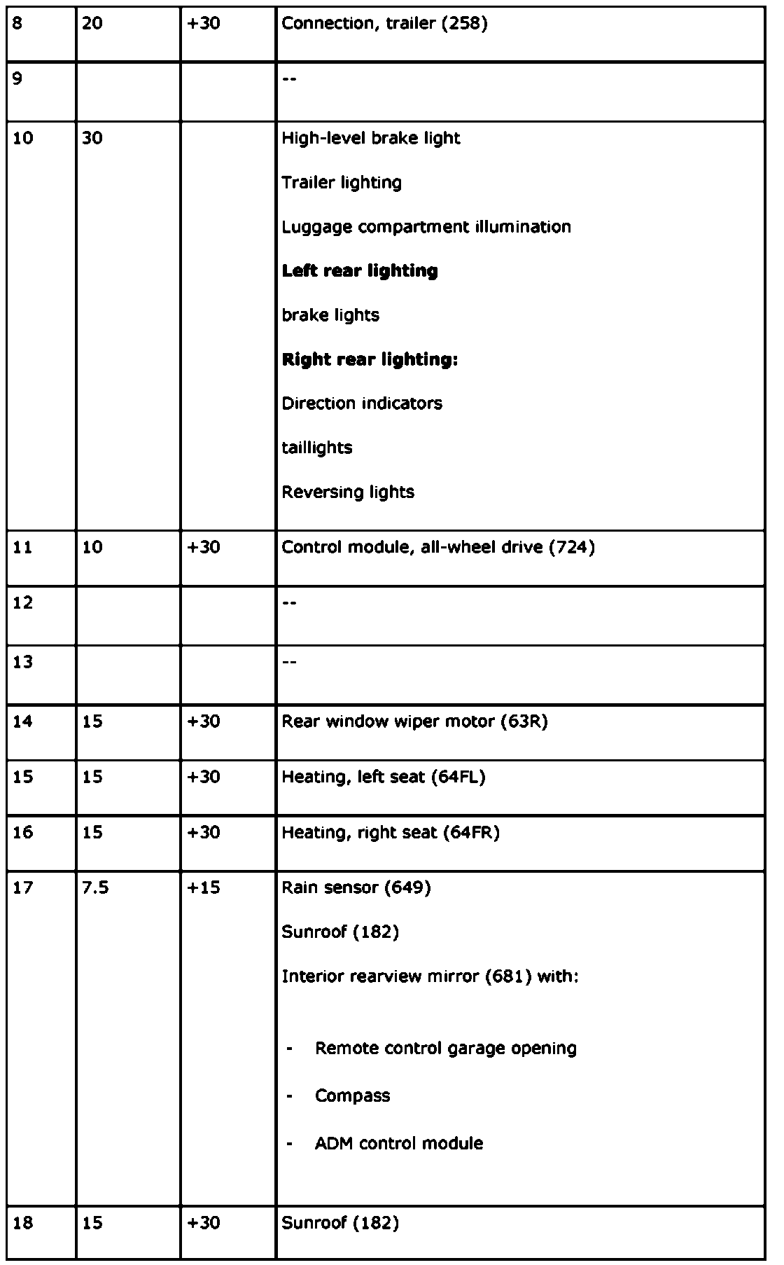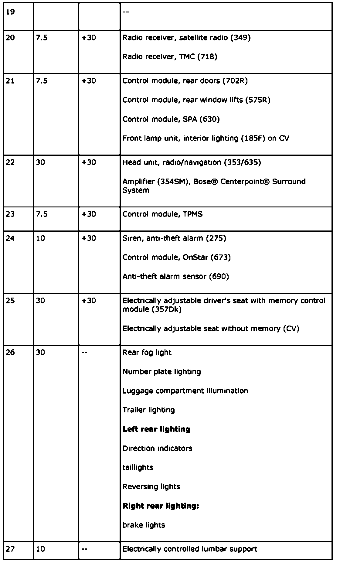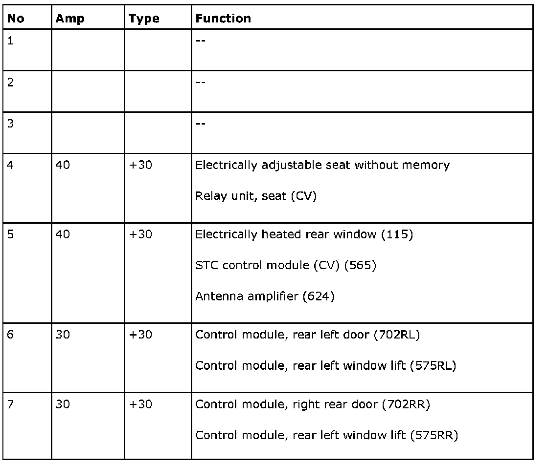 The electrical center can contain a greater number of fuses than those listed below. In such cases, these are not connected to a wiring harness.
