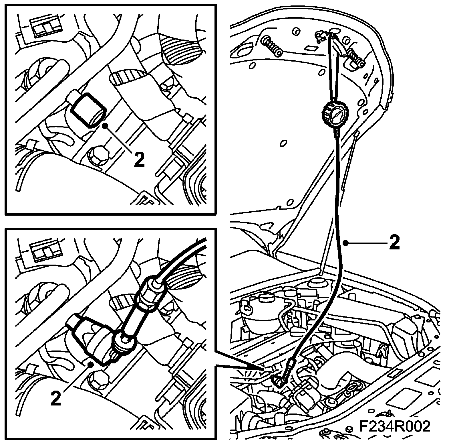 2. Unscrew the valve cap. Connect 83 93 852 Pressure measuring equipment, fuel and oil and 83 94 744 Adapter, fuel pressure gauge . Connect the adapter with "safety on" to the fuel rail. "Safety off" the adapter.
