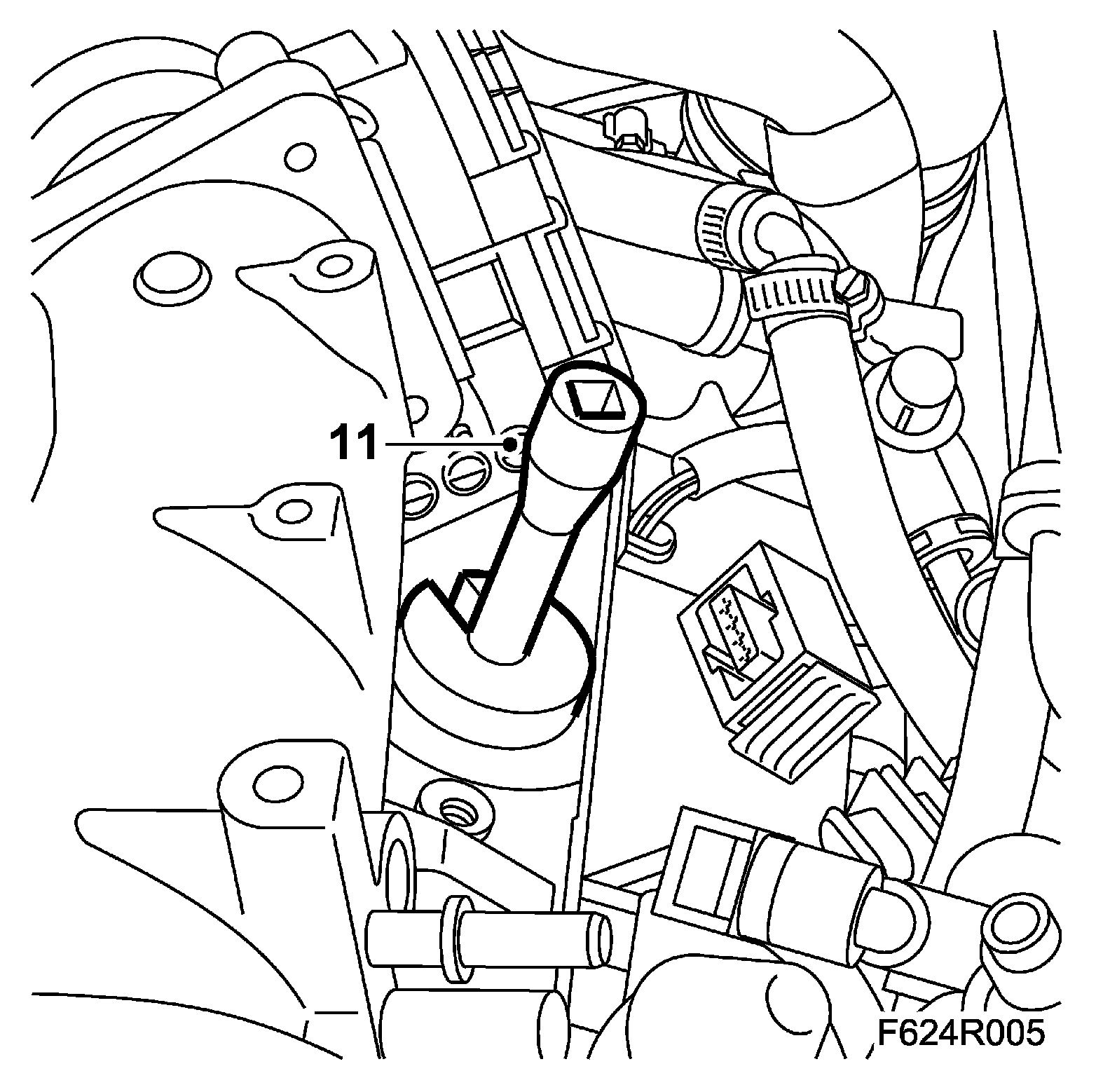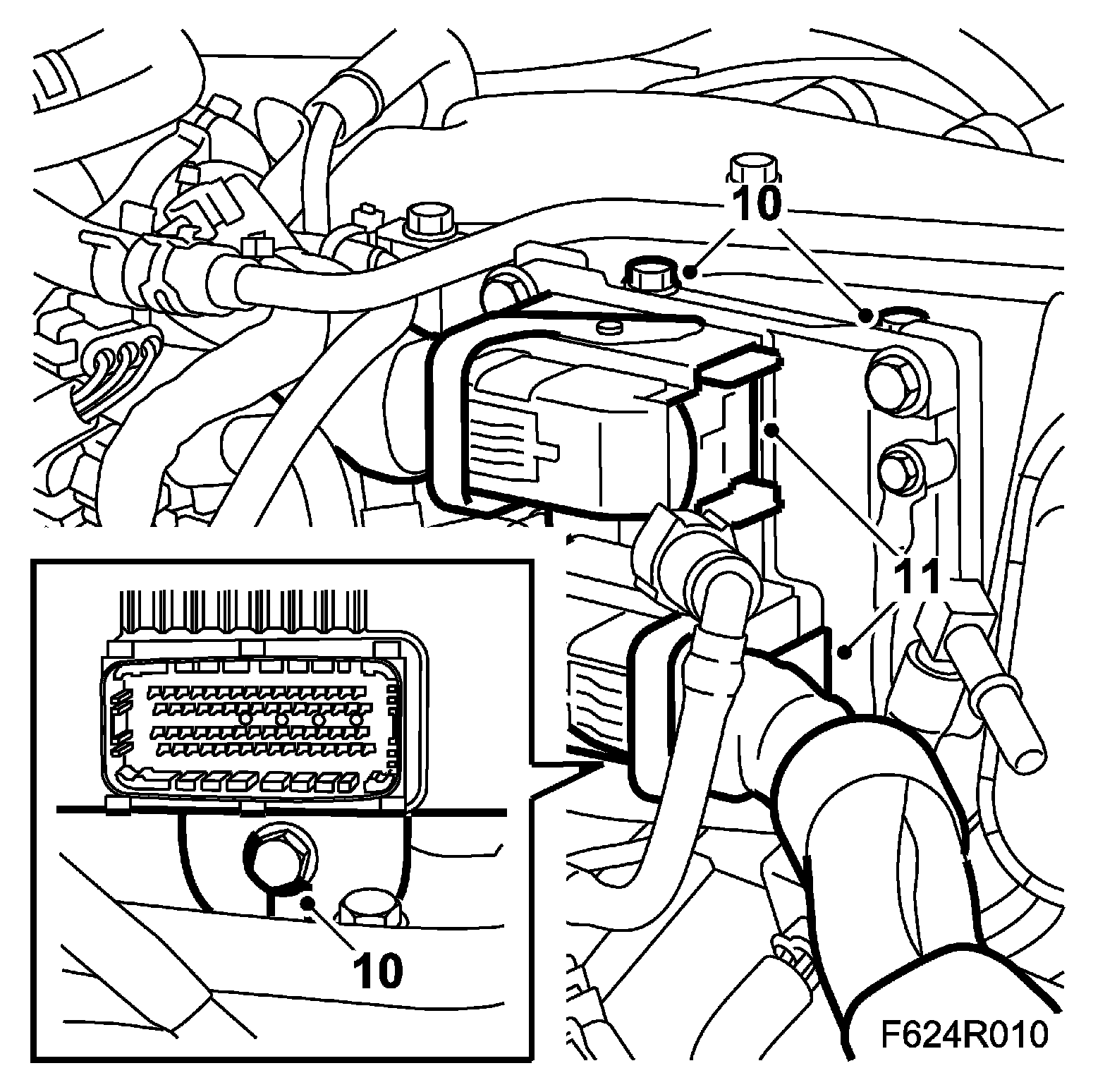 10. Fit the engine control module with mounting. The lower hole of the mounting is slotted.