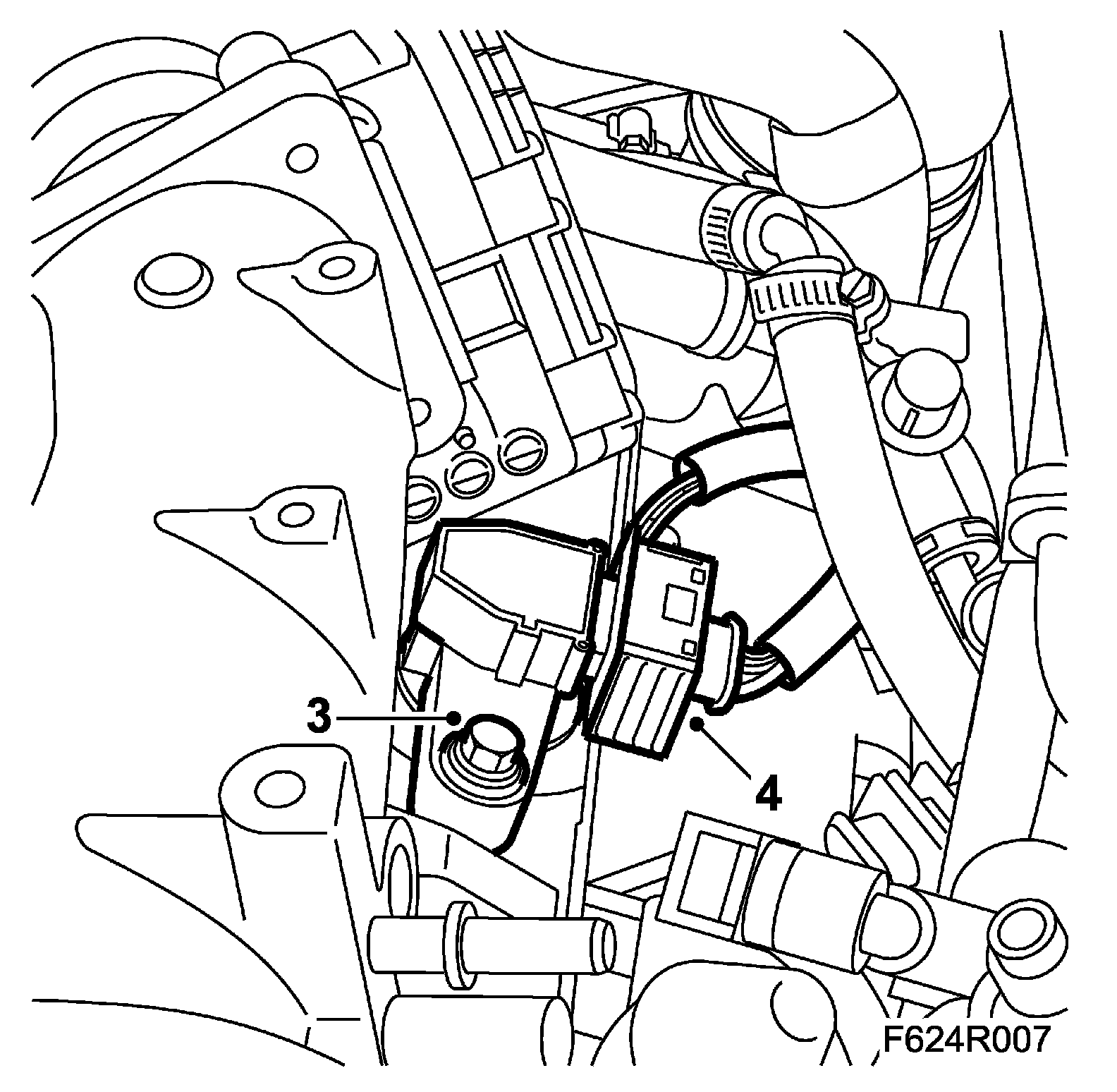 3. Remove the engine control module with mounting. The lower hole of the mounting is slotted.