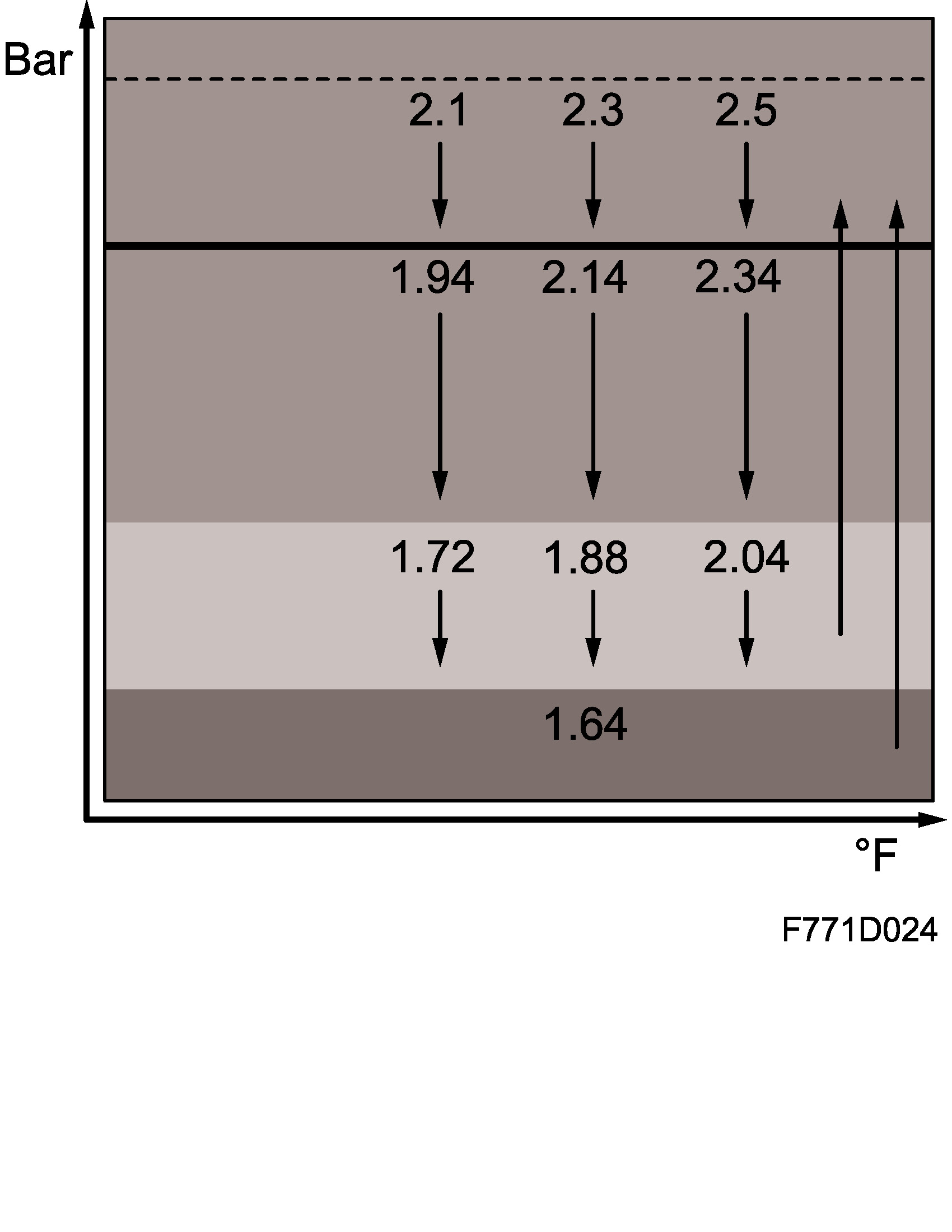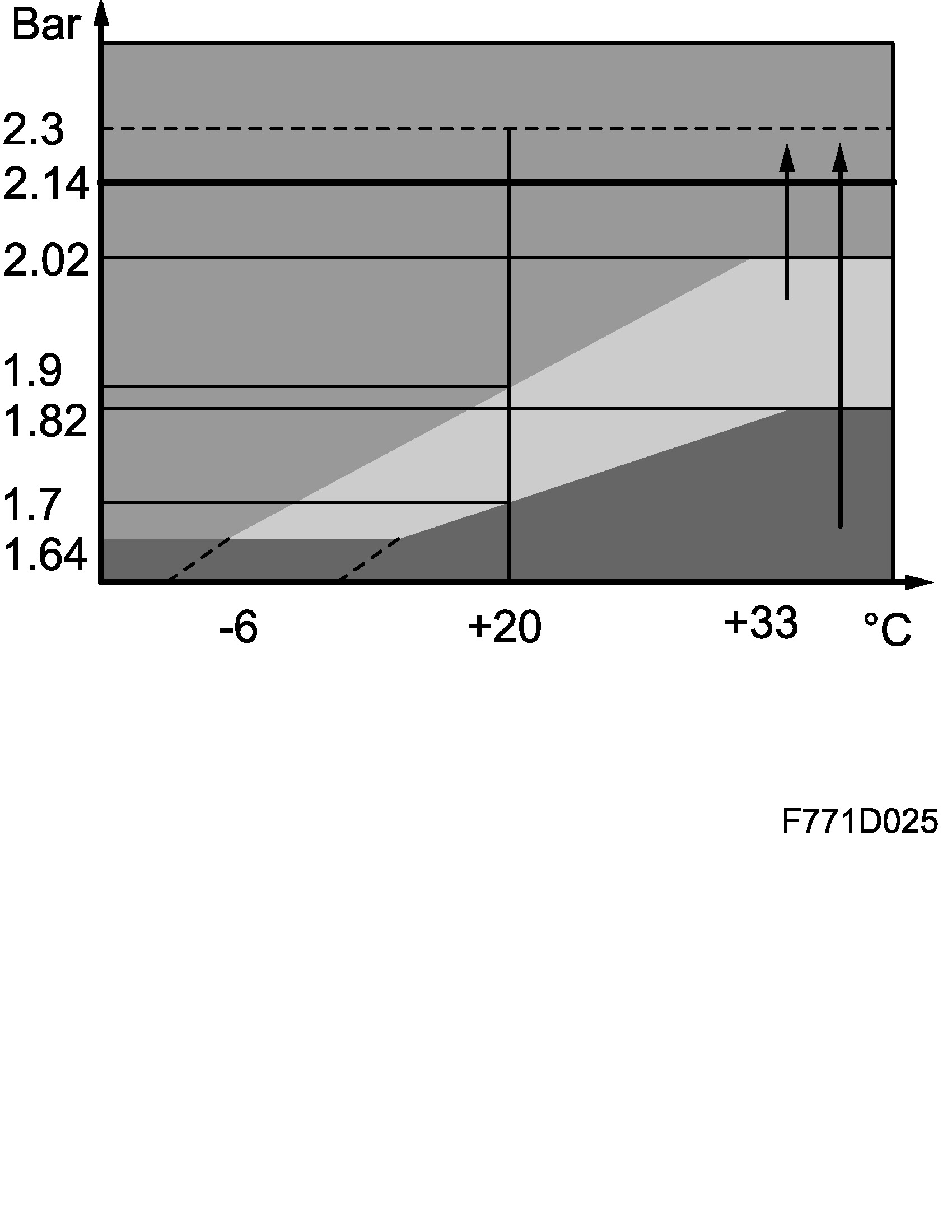 For example, if the system is programmed for a nominal tire pressure of 2.3 bar (33 psi), if tire temperature is + 20 degrees C a warning message is shown when tire pressure has dropped to 1.9 bar (27 psi). An alarm message is shown when tire pressure drops to 1.7 bar (25 psi). In order to reset the warning/alarm message, the tire must be pumped to at least 2.14 bar (31 psi). If tire temperature is + 35 degrees C, the warning message value is 2.02 bar (29) and the alarm message value is 1.82 bar (26 psi).