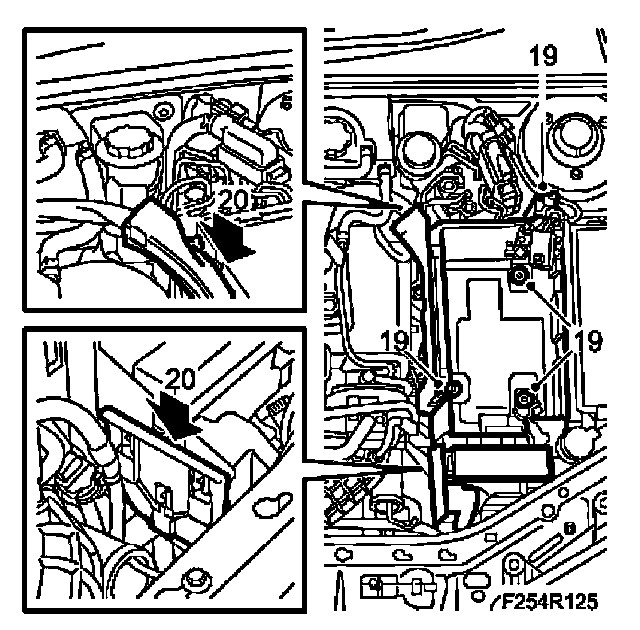 20. Fit the main fuse box in front of the battery tray and the cable duct on the side.