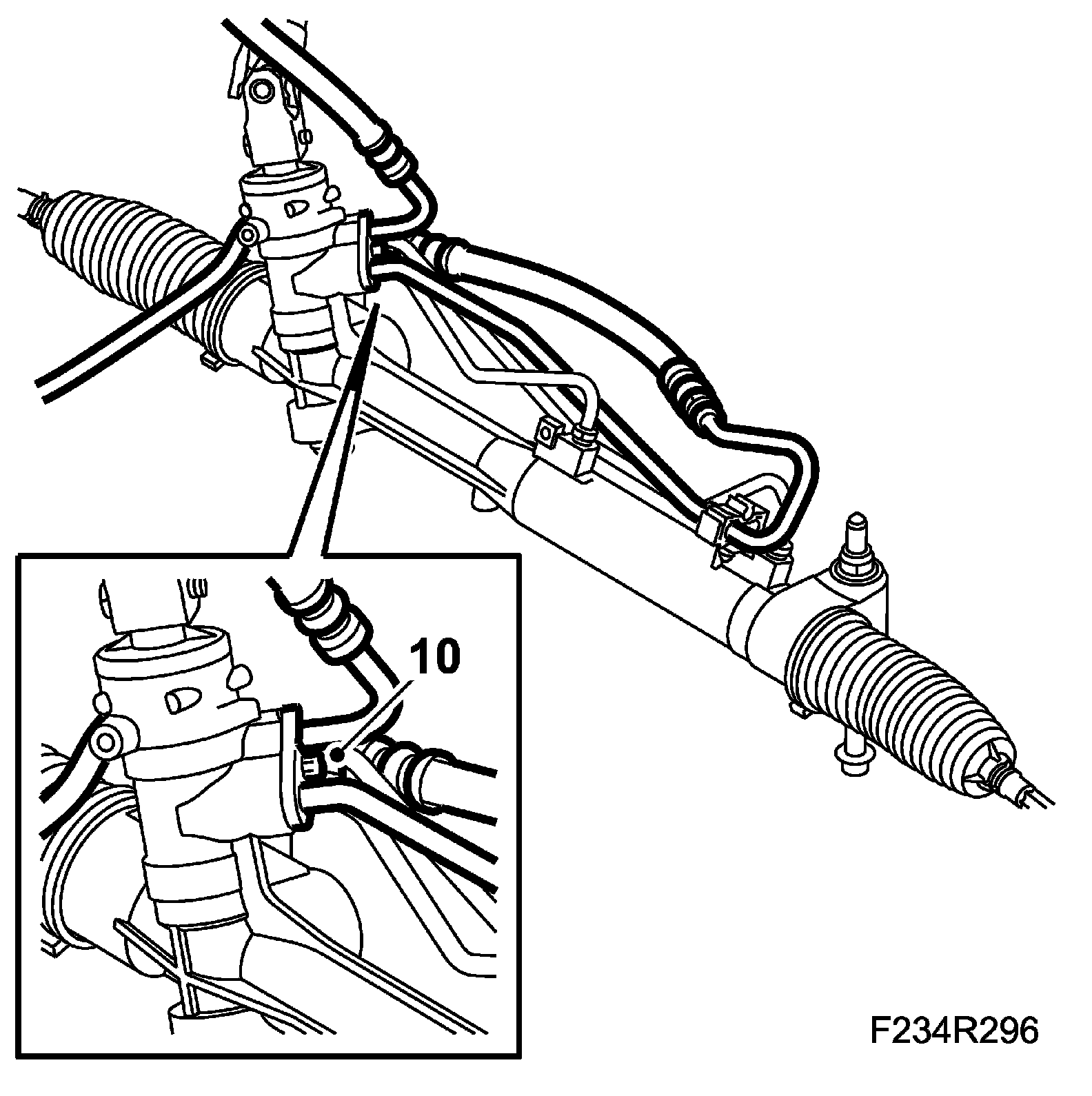 6. B284, RHD: Fit the power steering lines to the steering gear. Use new O-rings.
