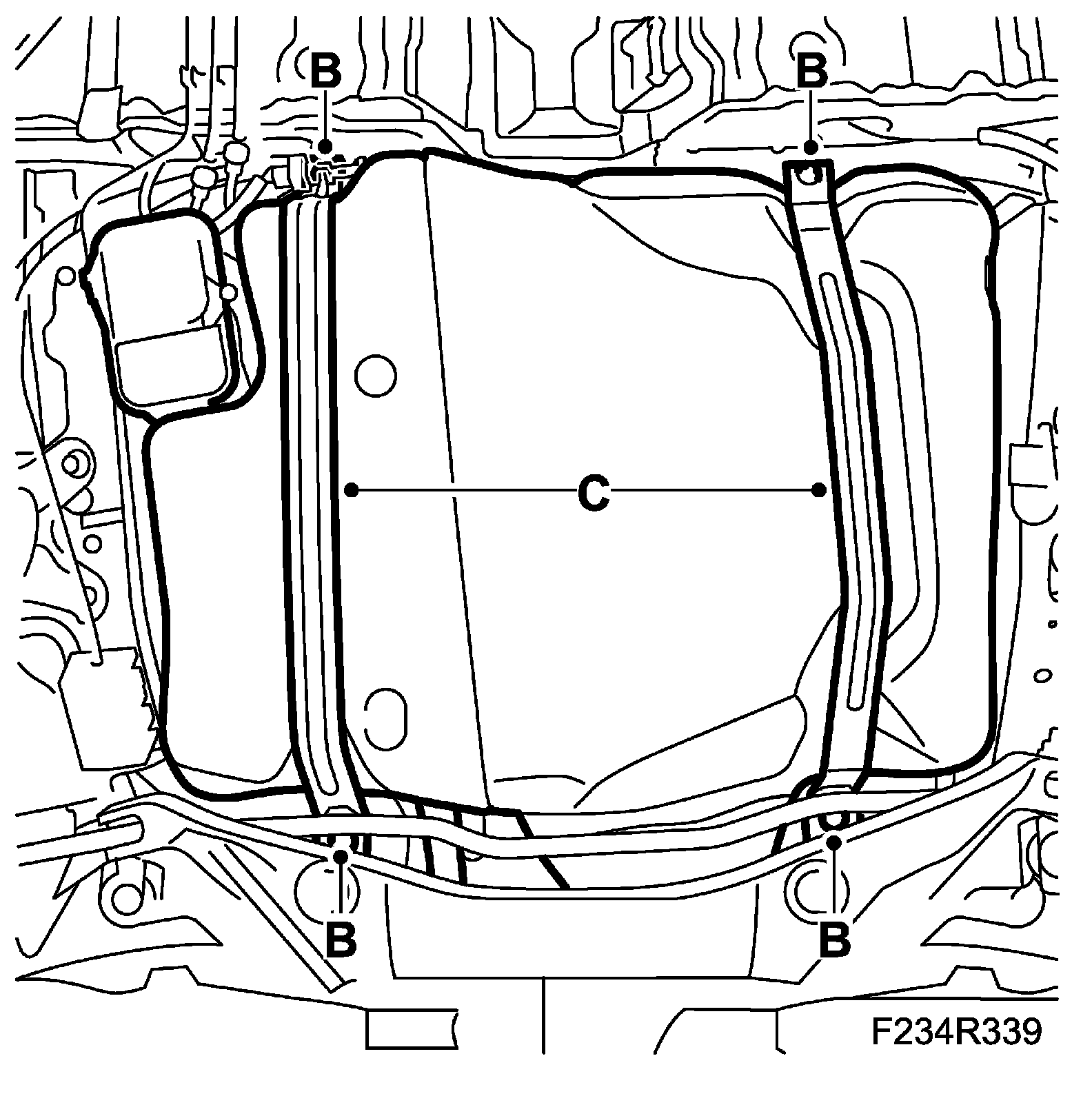 ^ Remove the bolts (B) for the tank strap (C).
