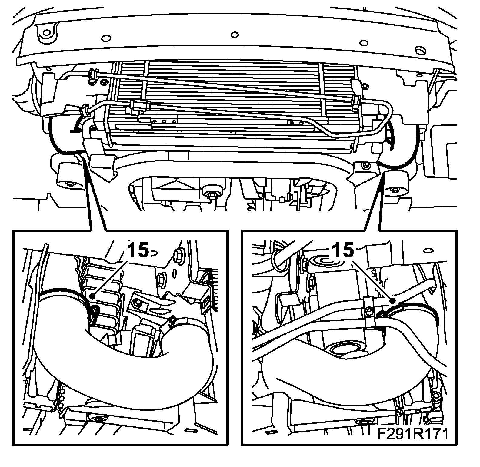 14. Remove the upper bolts of the charge air cooler.
