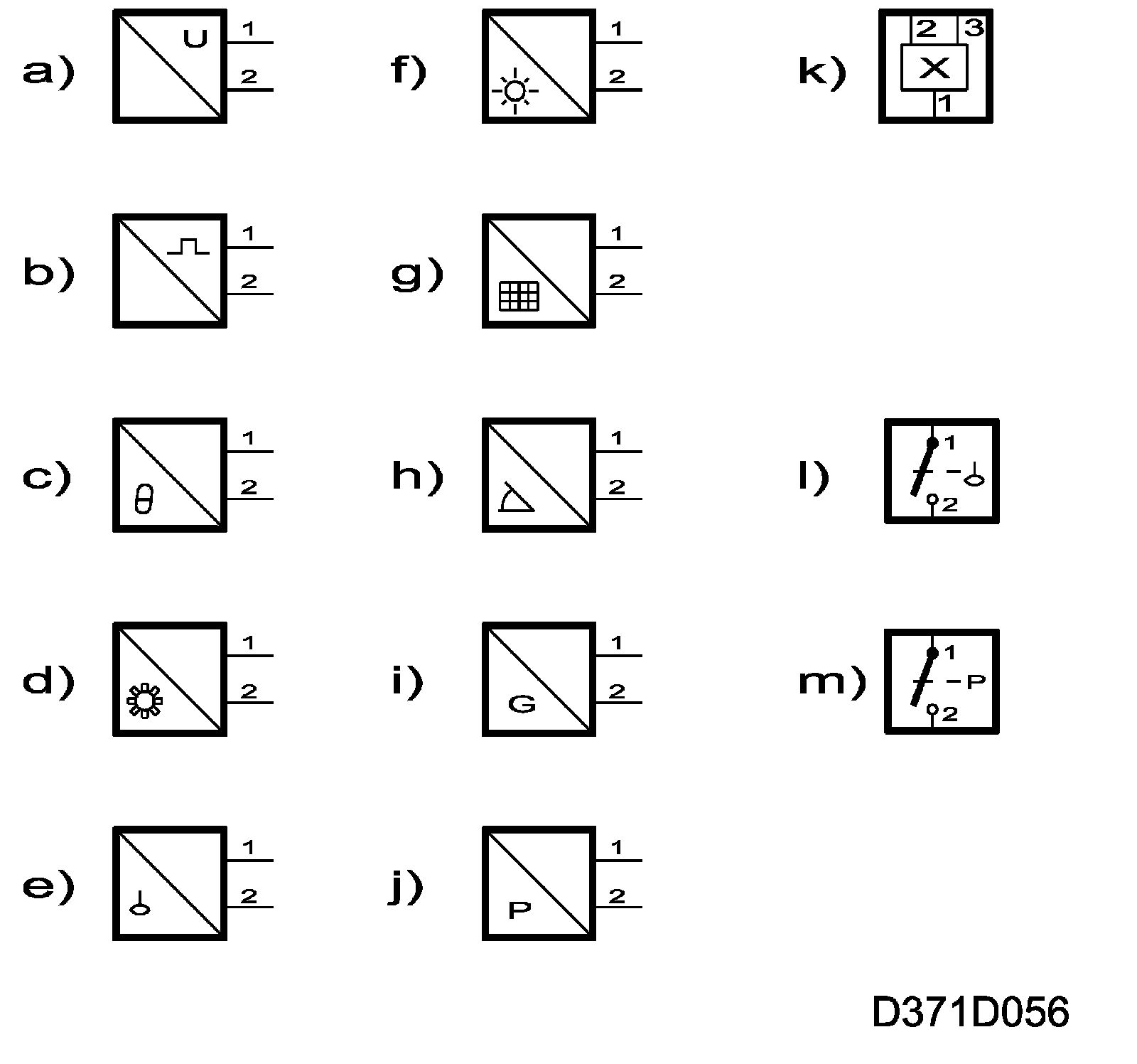The symbols for sensors and monitors have been simplified. The connector/output side of the sensors have an internal symbol showing the type of output signal and the other half is a symbol showing the measured quantity.