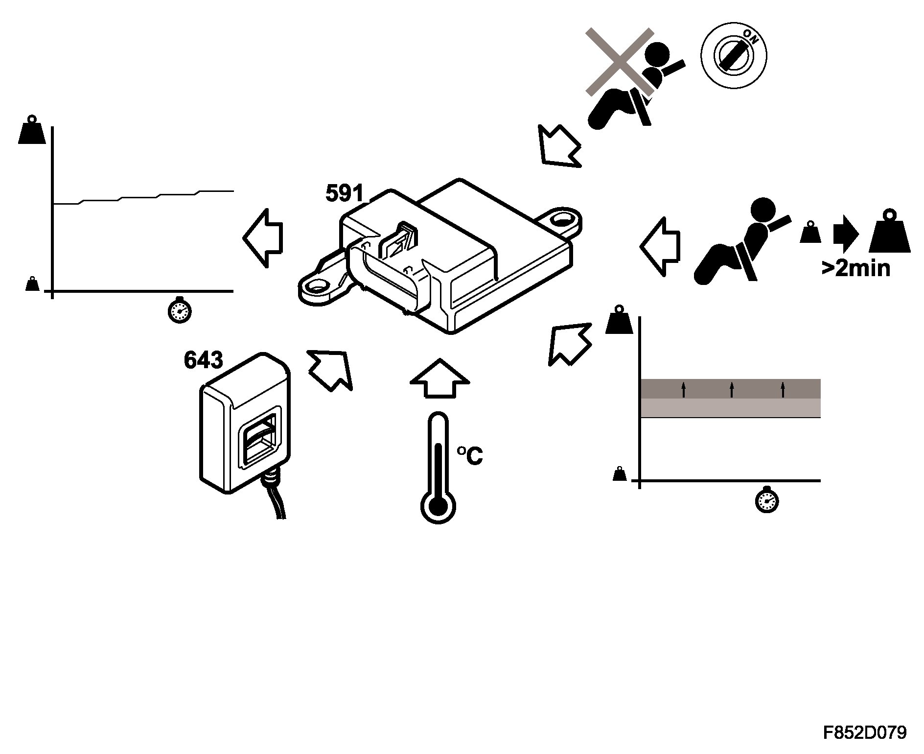 The limit for an adult corresponds to a woman weighing 46.7 kg or more. The limit for a child corresponds to a 6- year-old weighing 23.4 kg or more. The threshold value for the seat is the reference value of a load. Each car model has its own reference value that is preprogrammed by Saab. The nominal seat threshold value is a value that is based on the seat threshold value and then adapted to the weight in the seat.