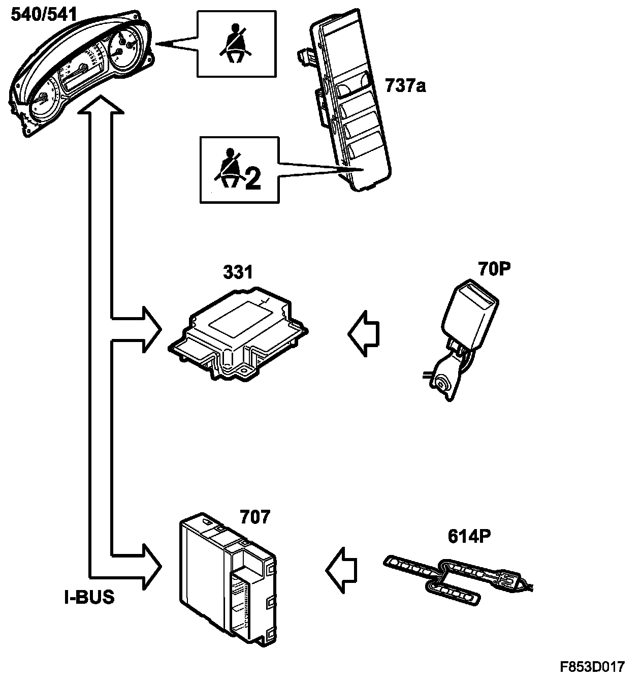 The passenger seat contains a sensor which detects if the seat is occupied. Each seat-belt buckle has a switch (Hall sensor) which is connected to the ACM (Airbag Control Module). If the seat-belt is not fastened, the ACM sends the following bus message on the I-bus: