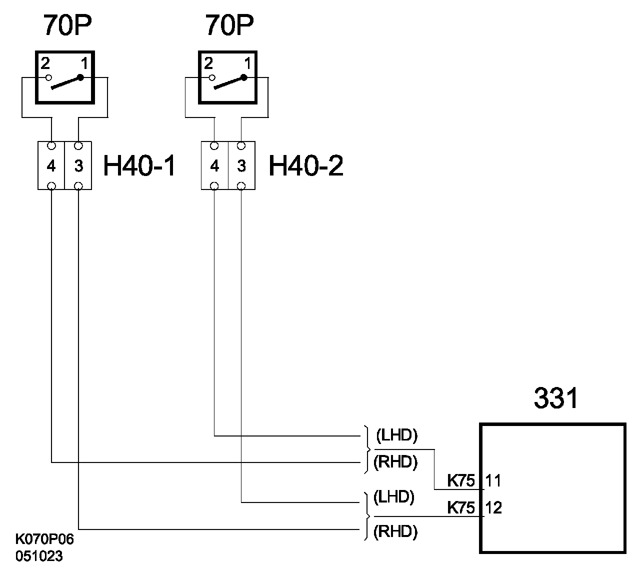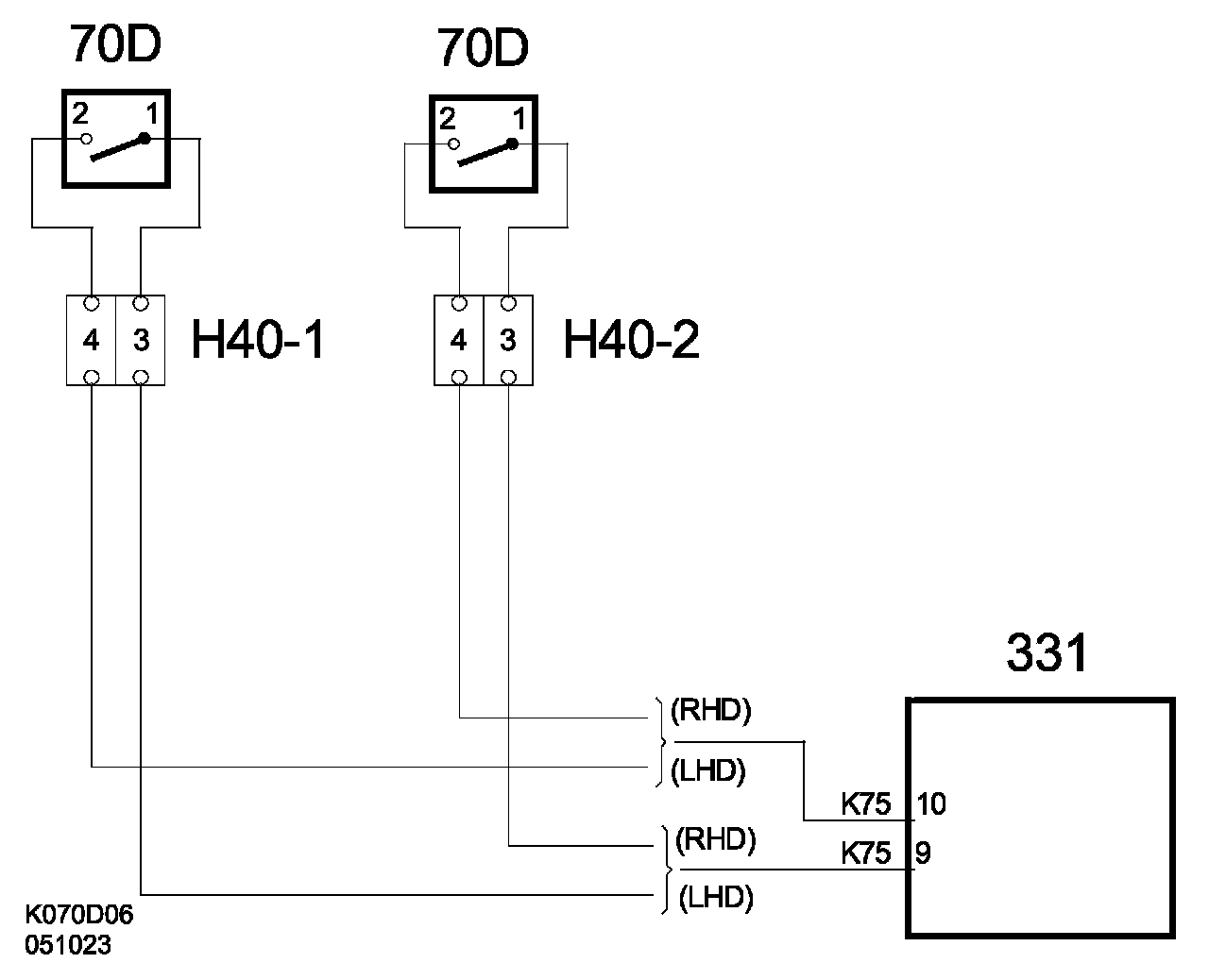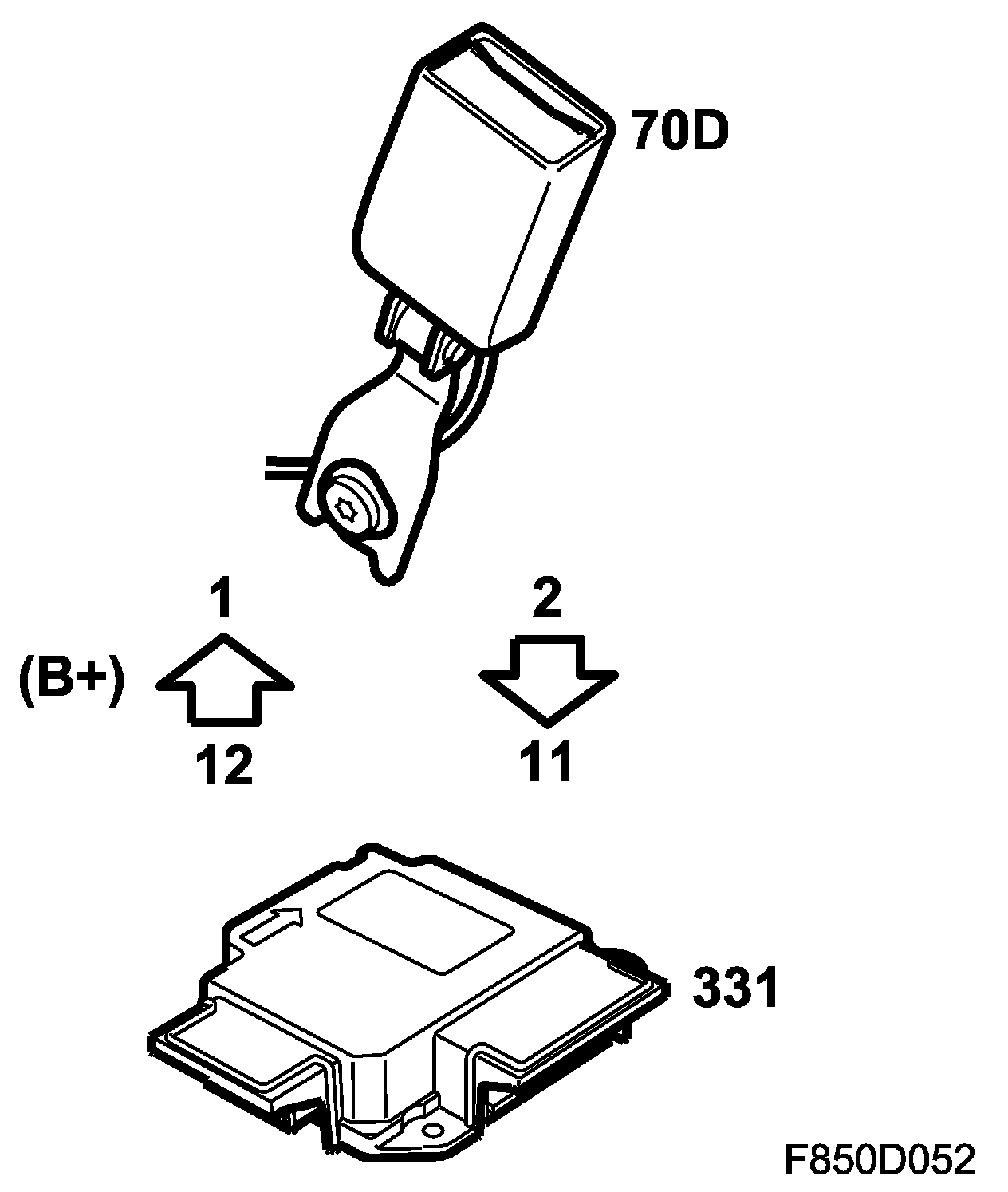 Driver's seat-belt buckle B+ feed to pin 1 from control module pin 12. The signal from seat-belt buckle pin 2 is connected to pin 11 on the control module (70D).