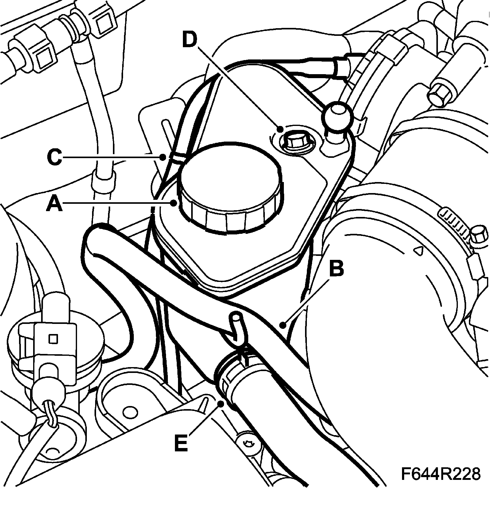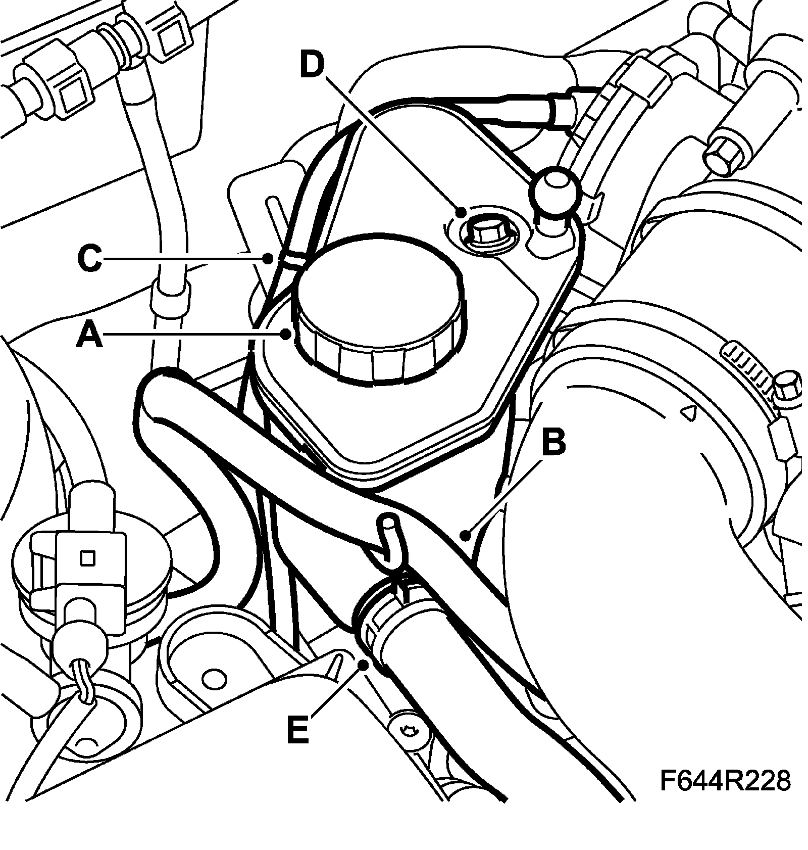 ^ Remove the screw (D) for the power steering fluid reservoir.