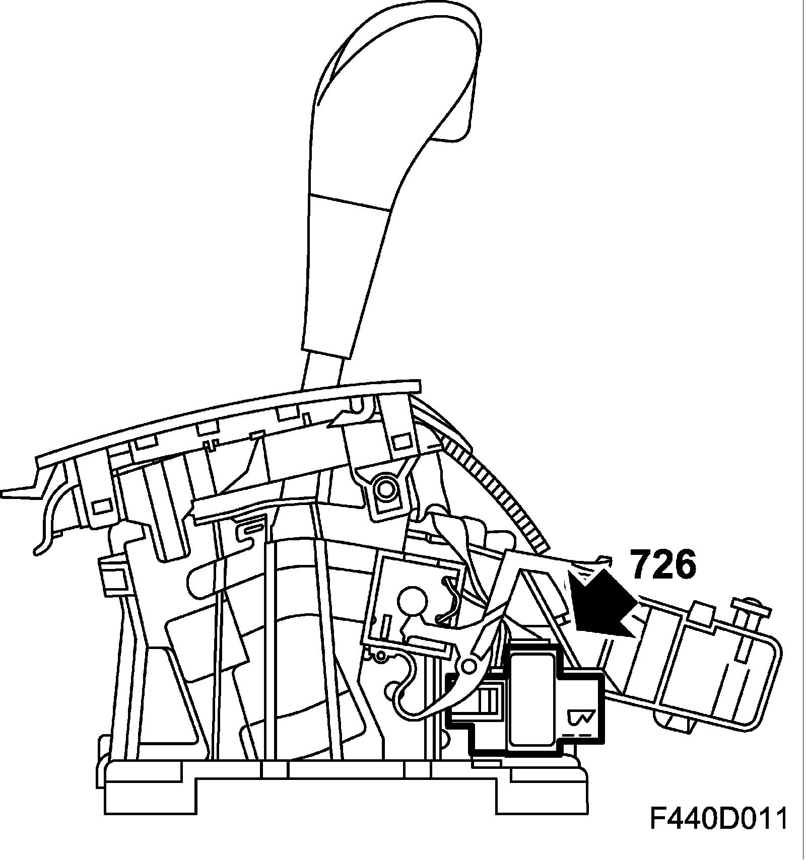 The selector lever housing contains the following blocking functions: Park Brake Shift-lock and gear position detent. The Park Brake Shift-lock function means the brake pedal must be depressed and the ignition key must be turned to OFF or further before the gear selector can be moved away from the P and N positions.