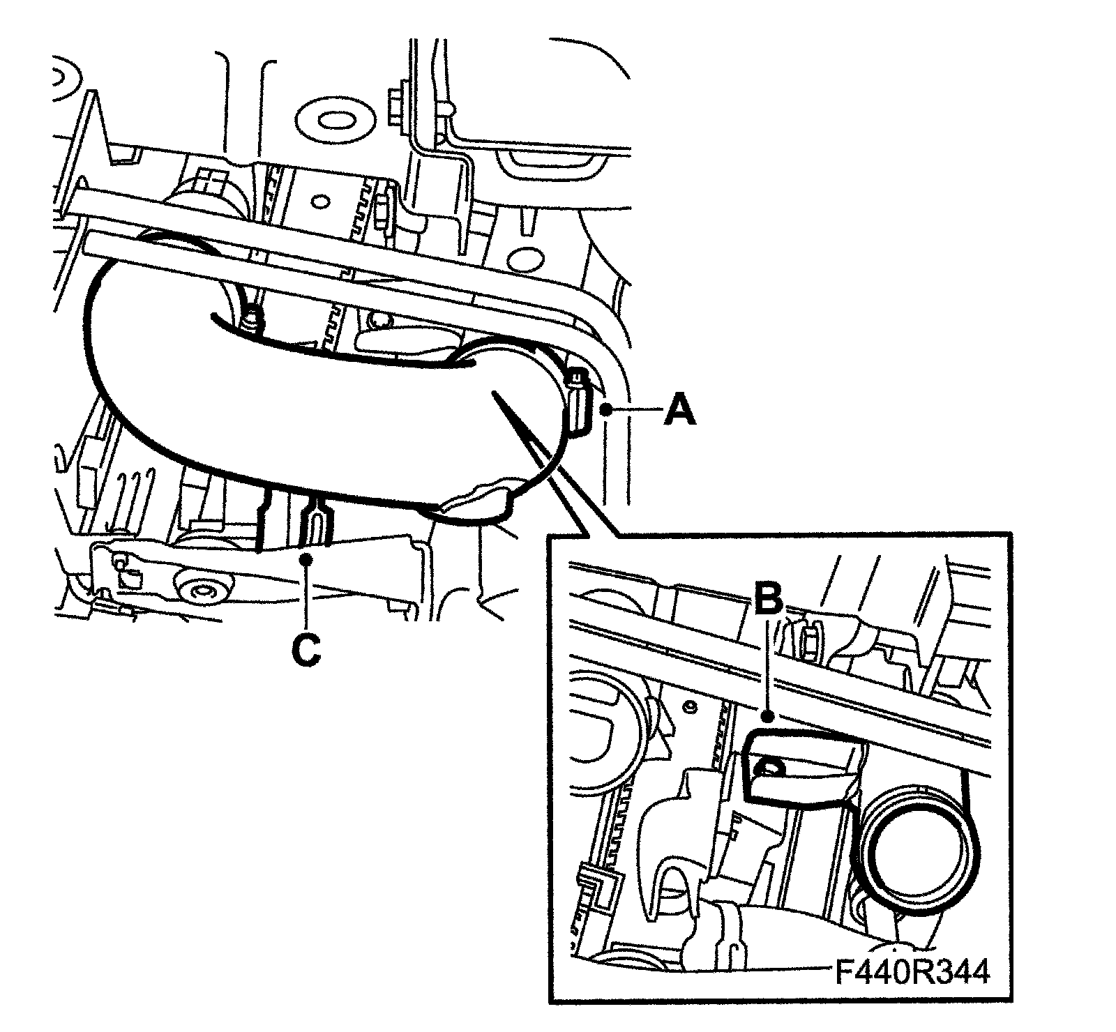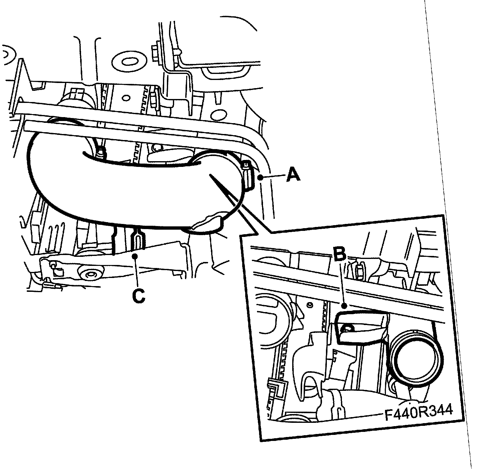9. Remove the lower cooler hose (C) from the cooler.