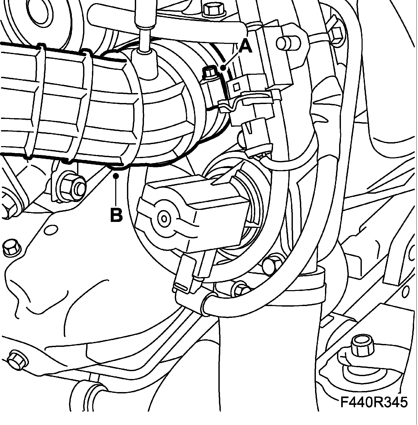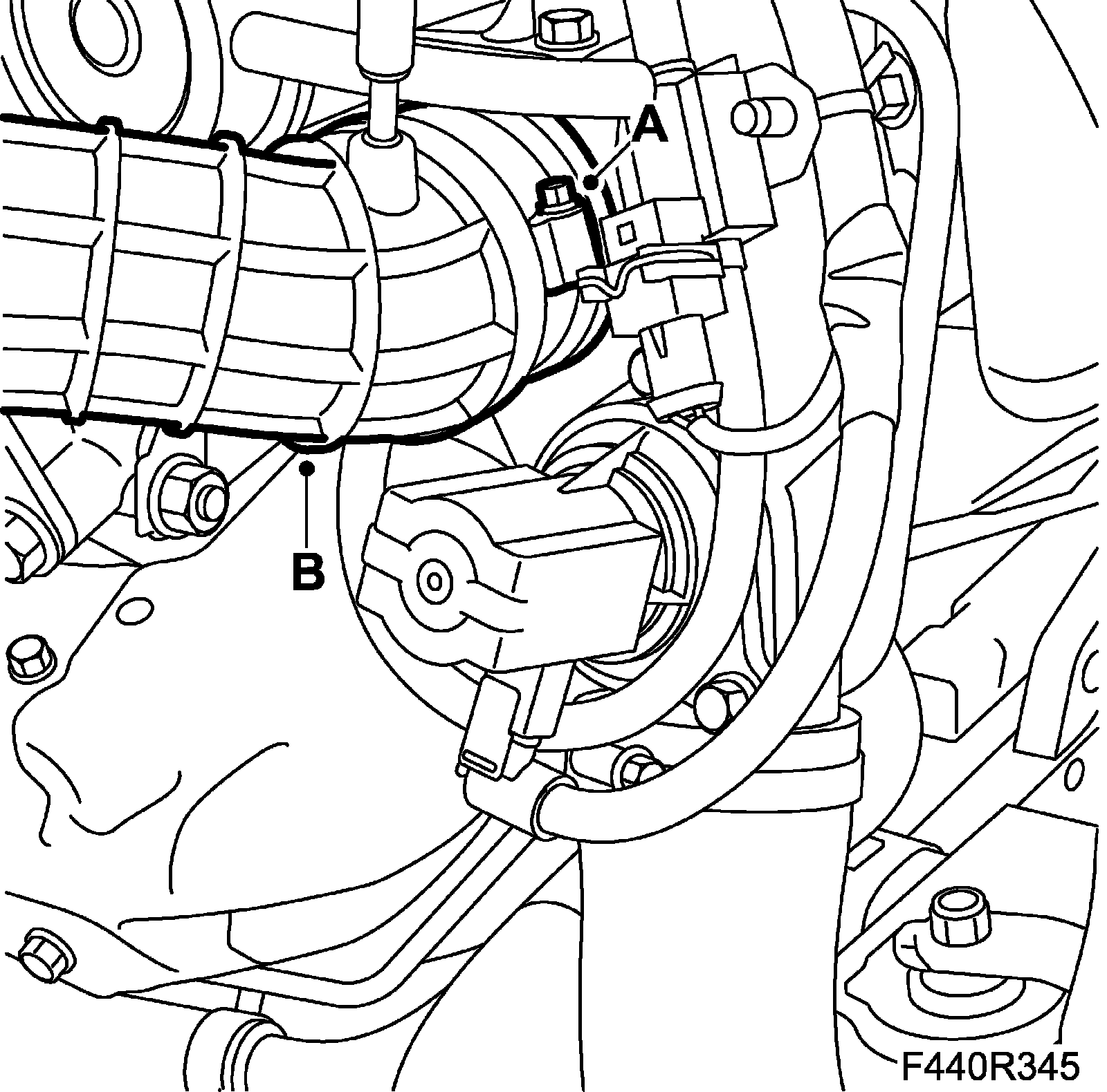 13. Fit the bypass valve (B) to the turbo.