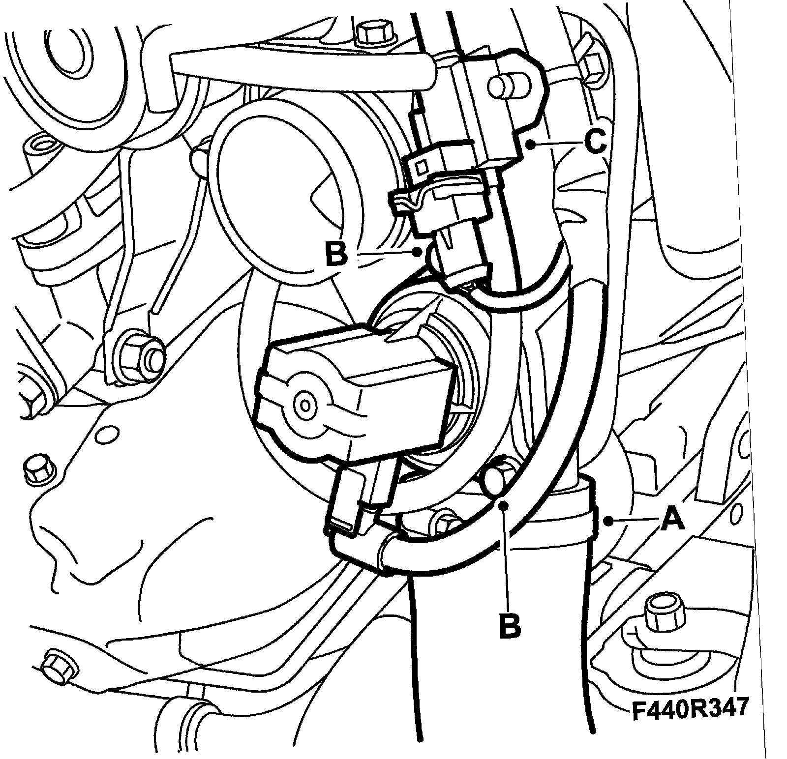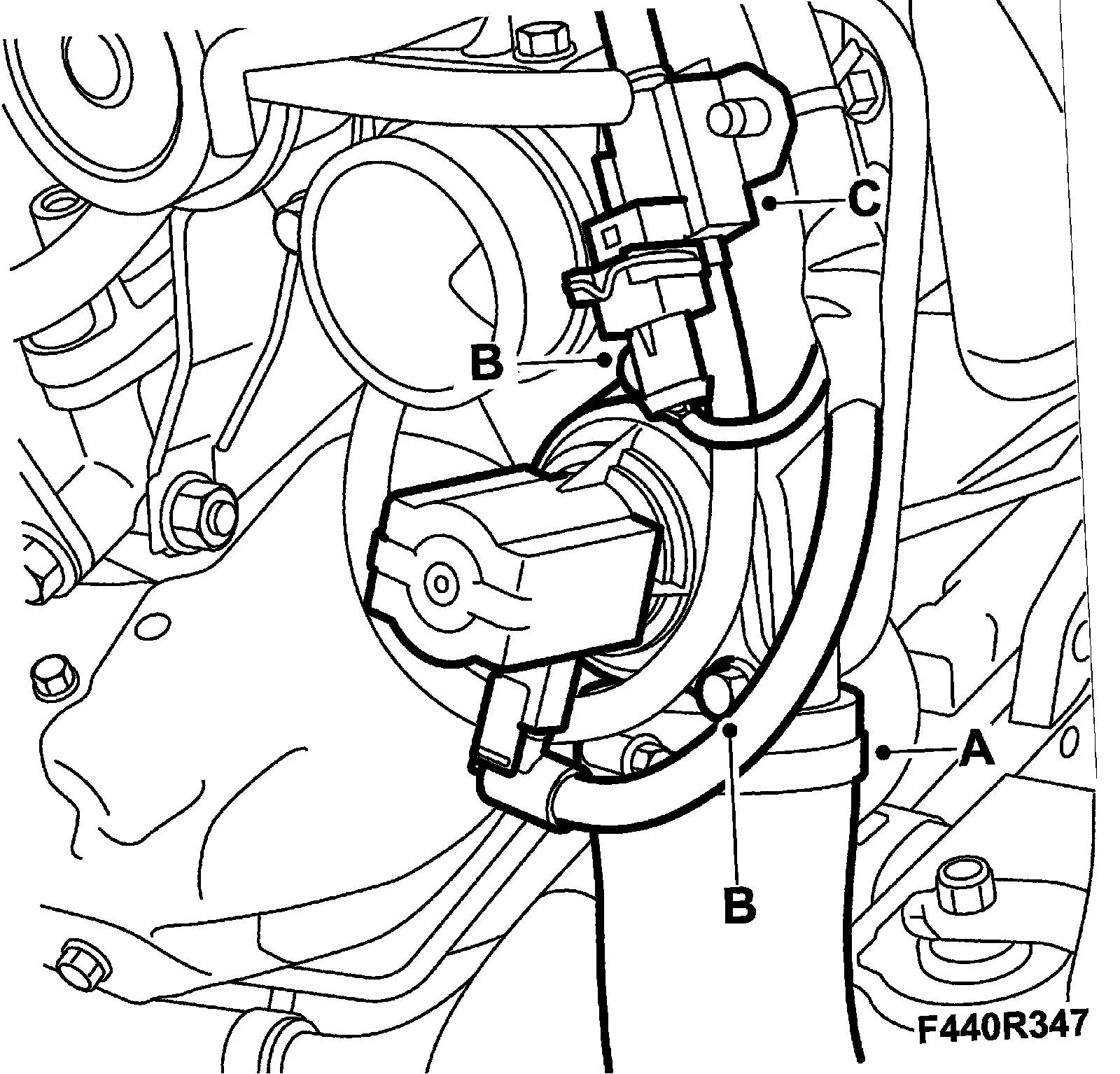 14. Remove the bypass valve from the turbo (C)