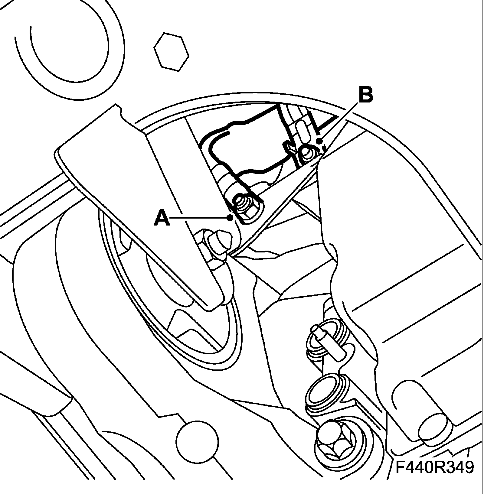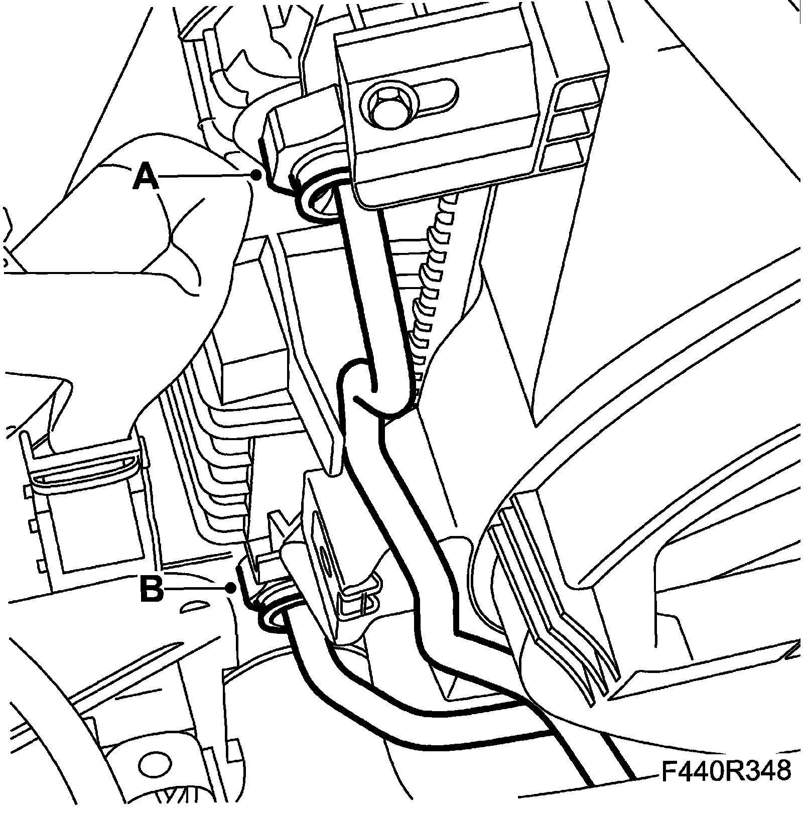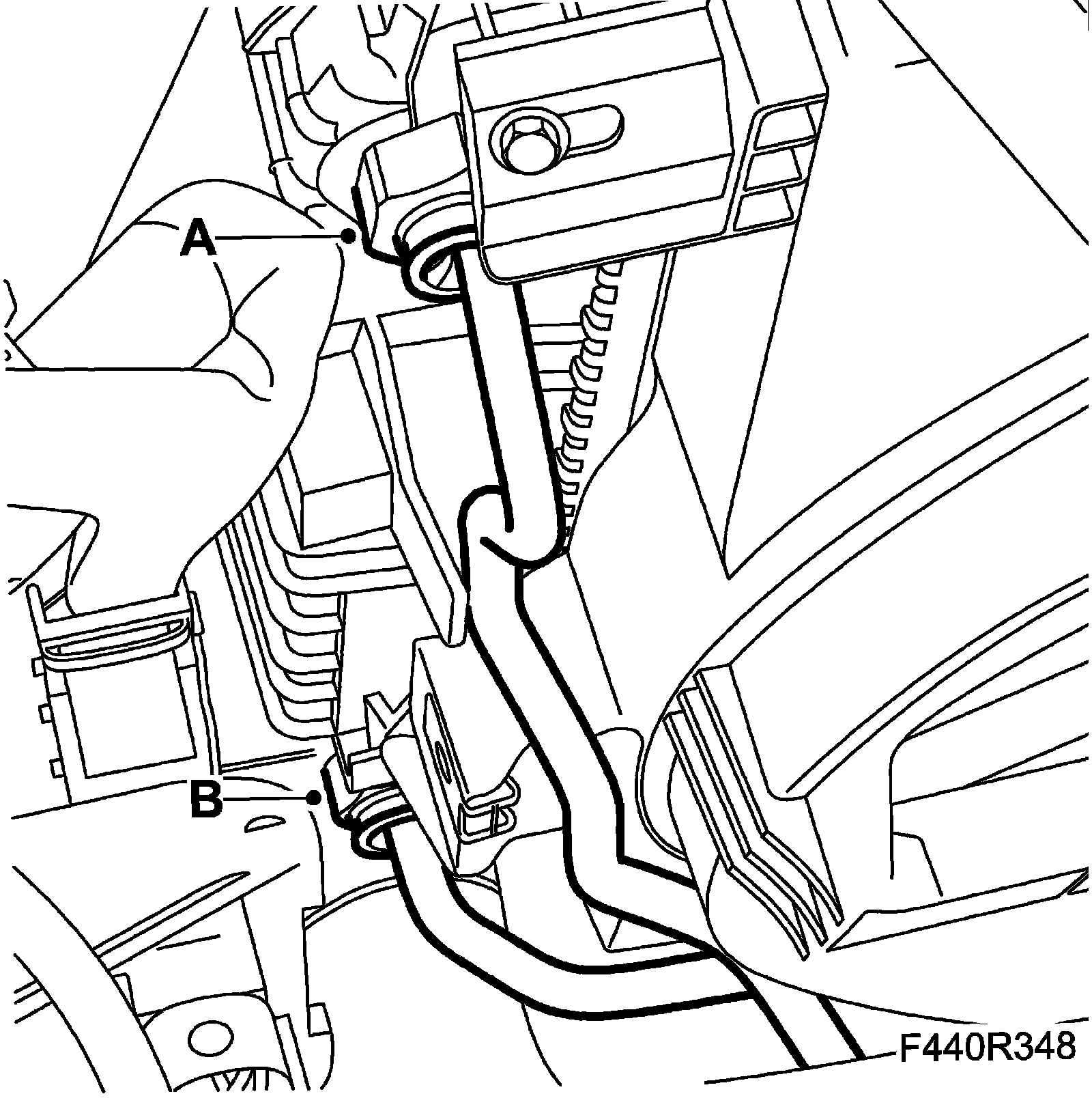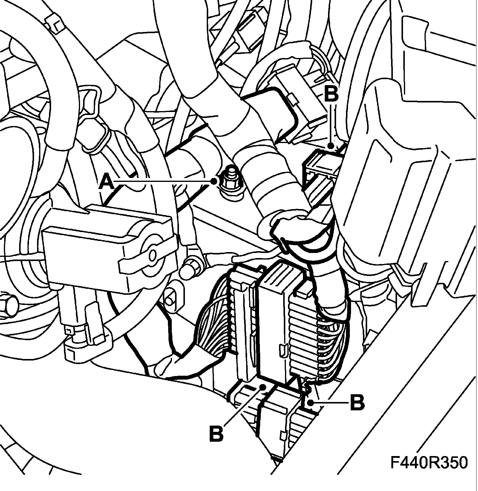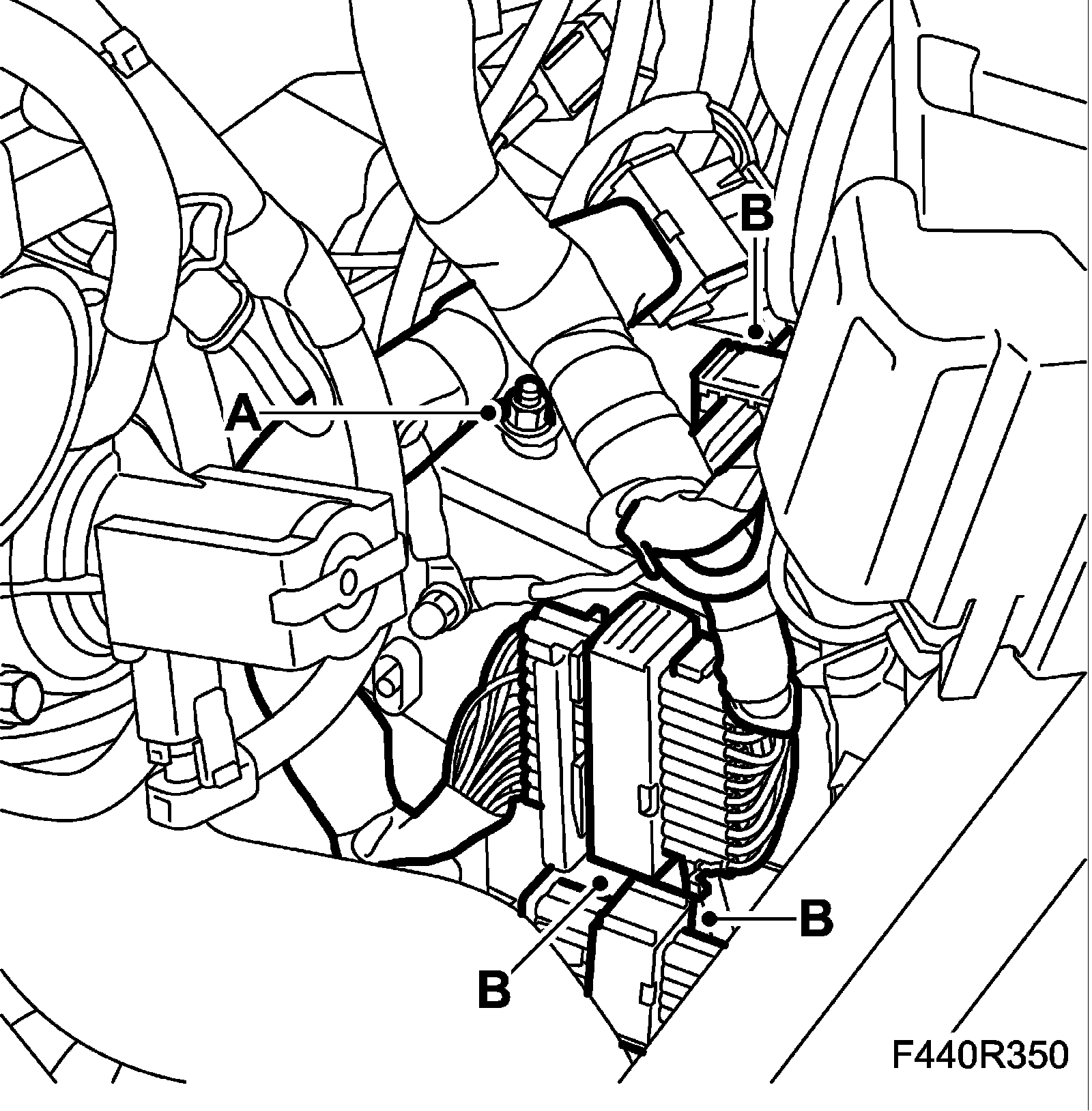 10. Fit the ground lead (A) and the clip (B) at the starter motor.