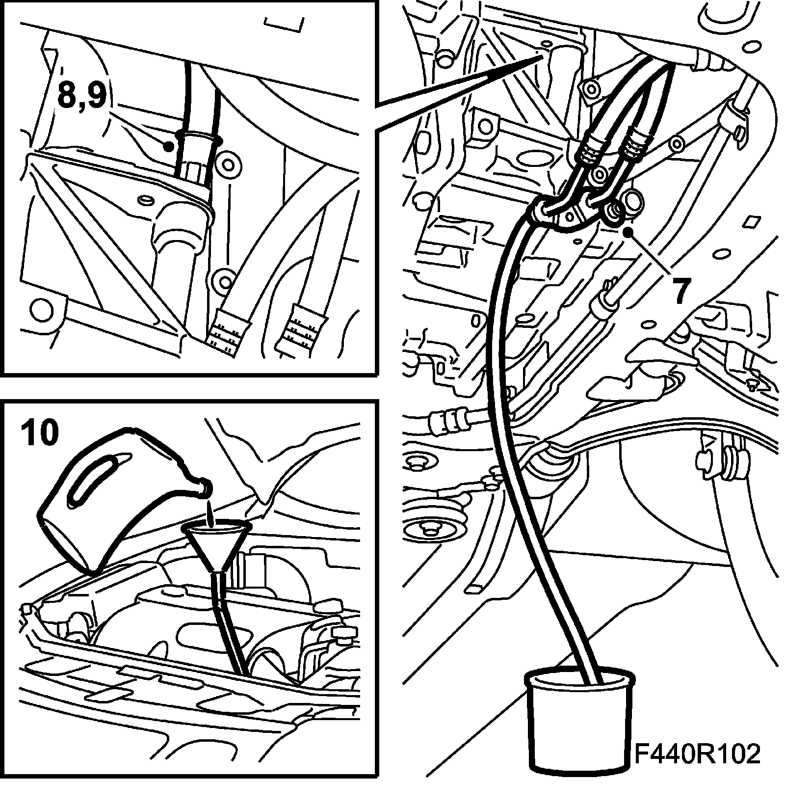9. Connect the hose with 87 92 822 Oil filler funnel to the dipstick hole.