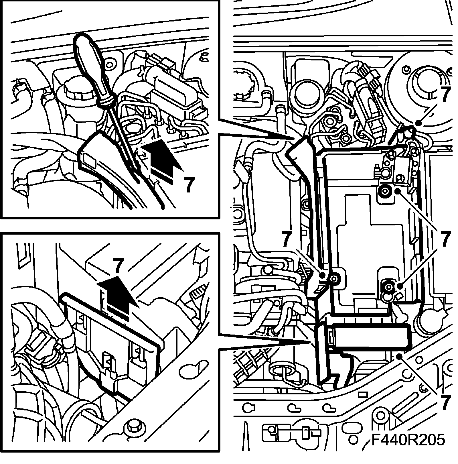 7. Remove the cable duct, bonnet switch electrical connection and the electrical center from the battery tray. Remove the battery tray.