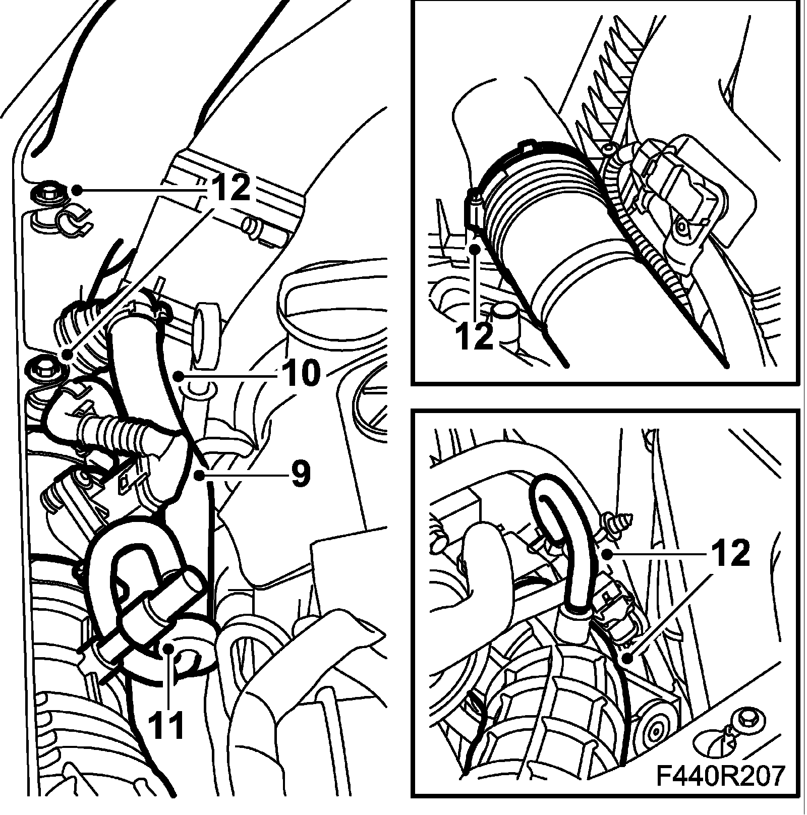 12. Remove the mass air flow sensor and the hoses of the turbocharger.