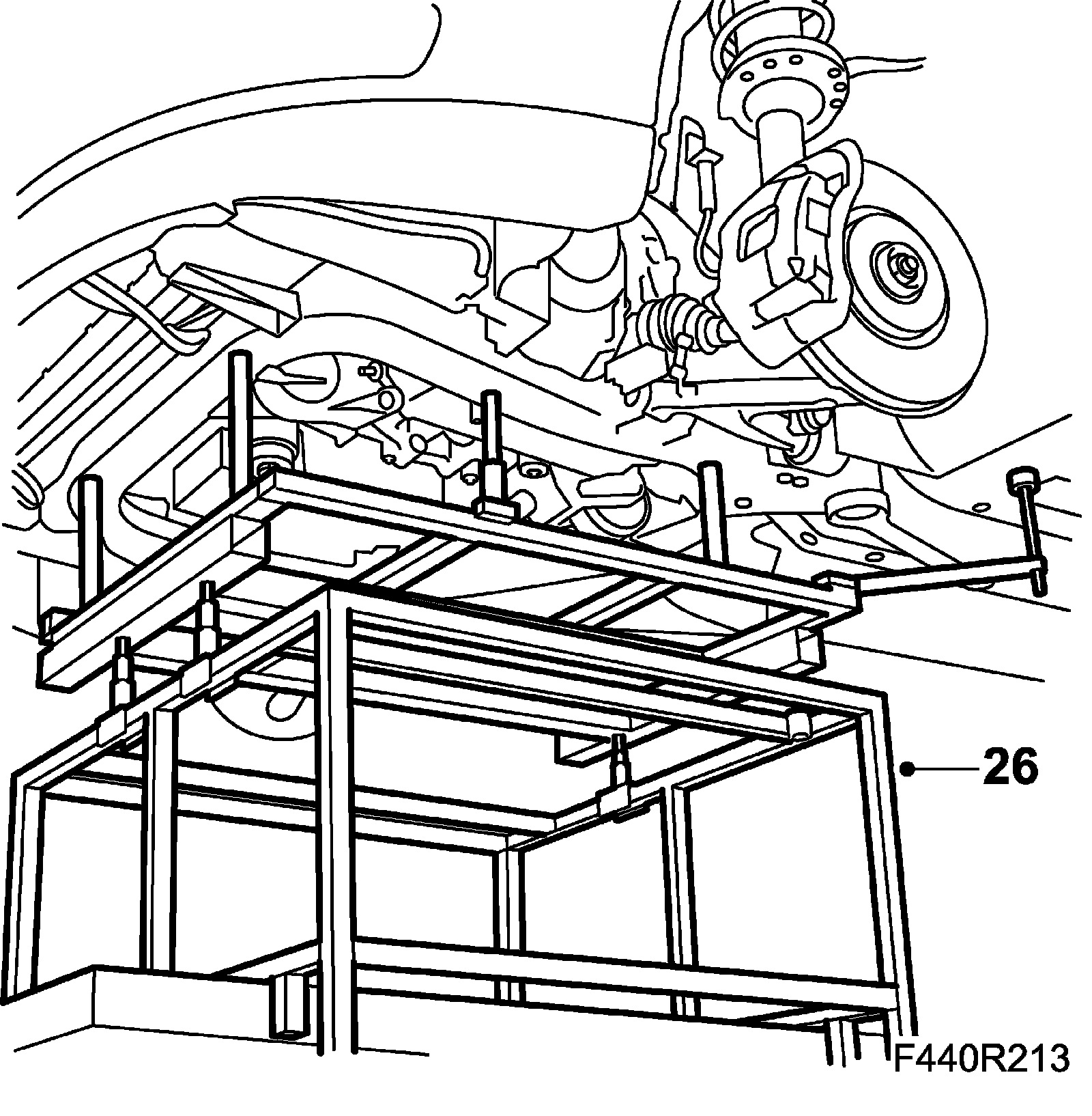 26. Place 83 95 311 Trolley lift under the vehicle. Fit 83 94 801 Parent fixture, 83 95 188 Basic fixture, 83 95 170 Adapter (4 pcs) and 83 96 137 centering tool, subframe - body.