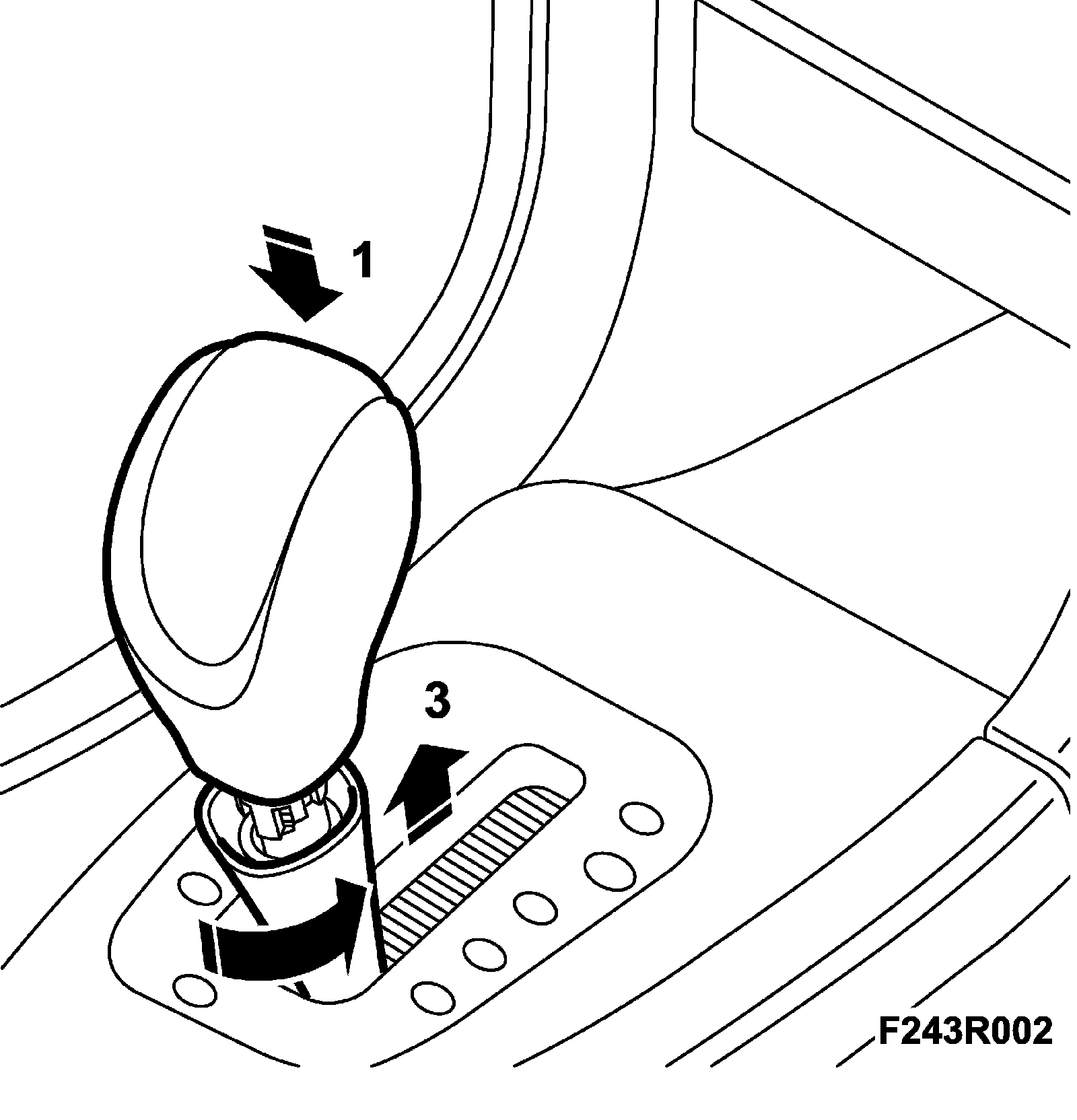 2. Turn the locking sleeve slightly clockwise and press down. Hold in the release button on the selector lever and pull up the knob.