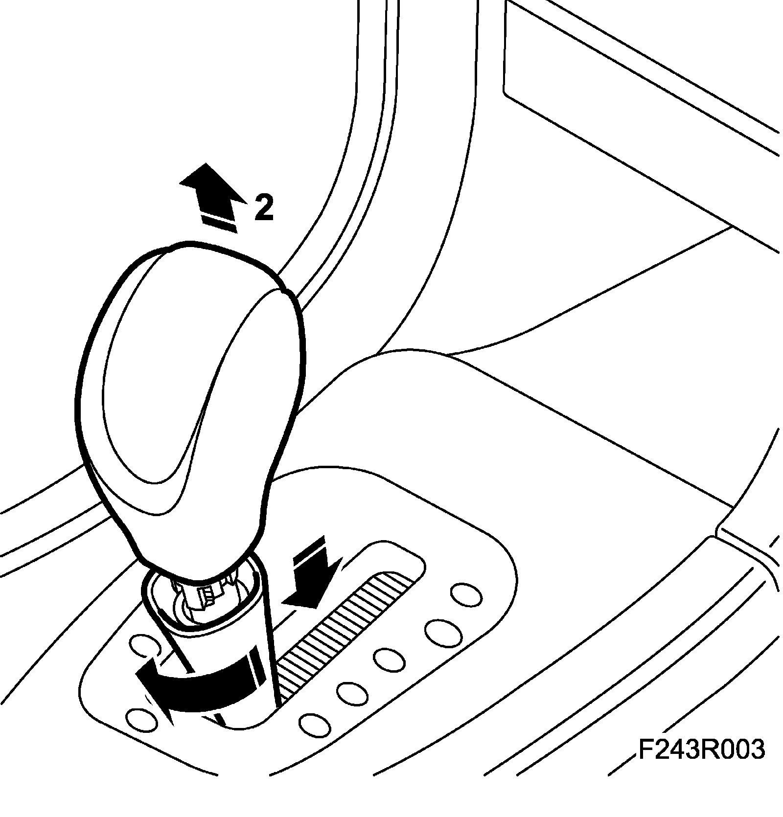 2. Turn the locking sleeve slightly clockwise and press down. Hold in the release button on the selector lever and pull up the knob. Lift up the locking sleeve.