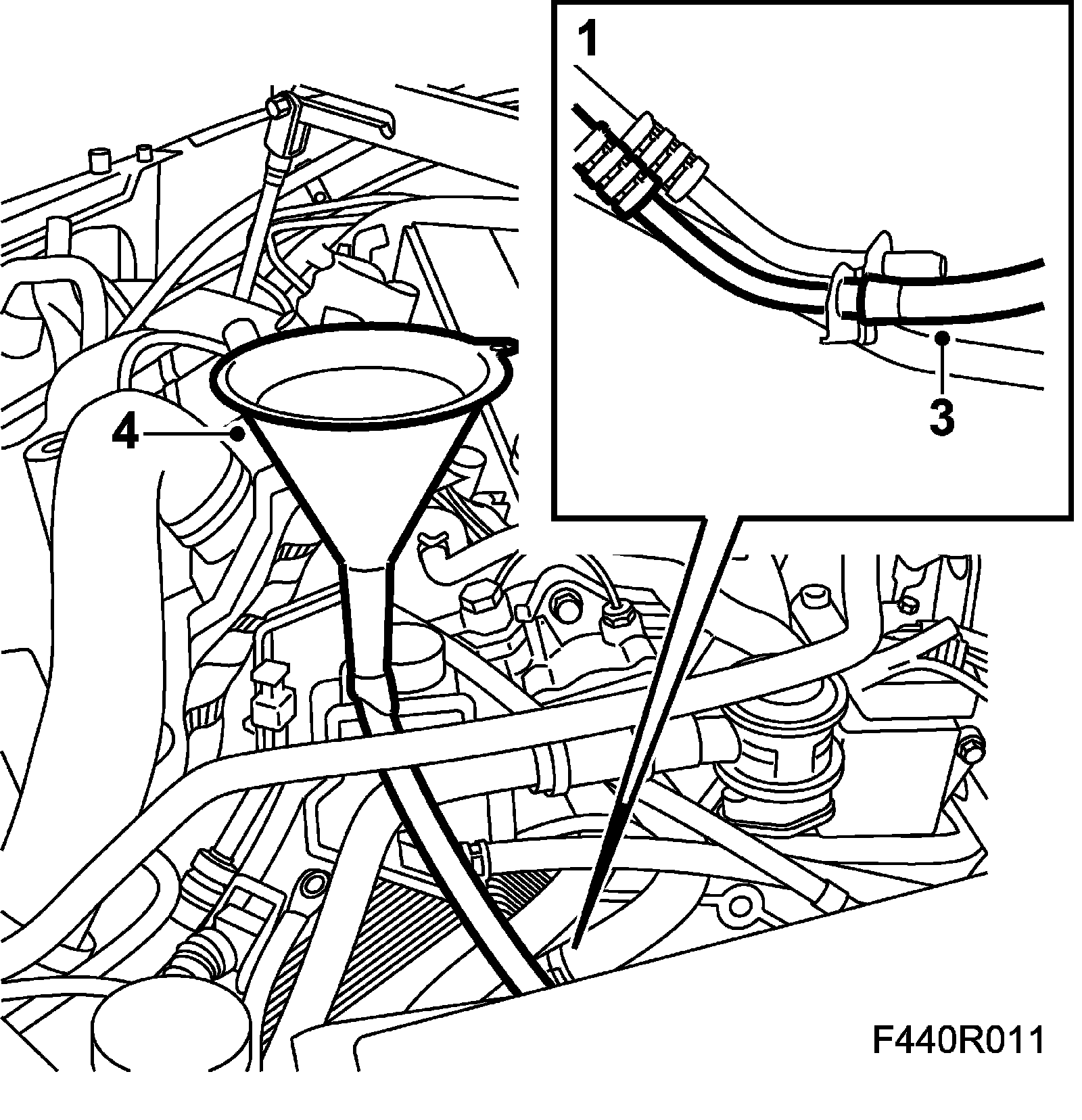 4. Connect a funnel to the plastic hose and pour 0.5 liters of automatic transmission fluid into the funnel.