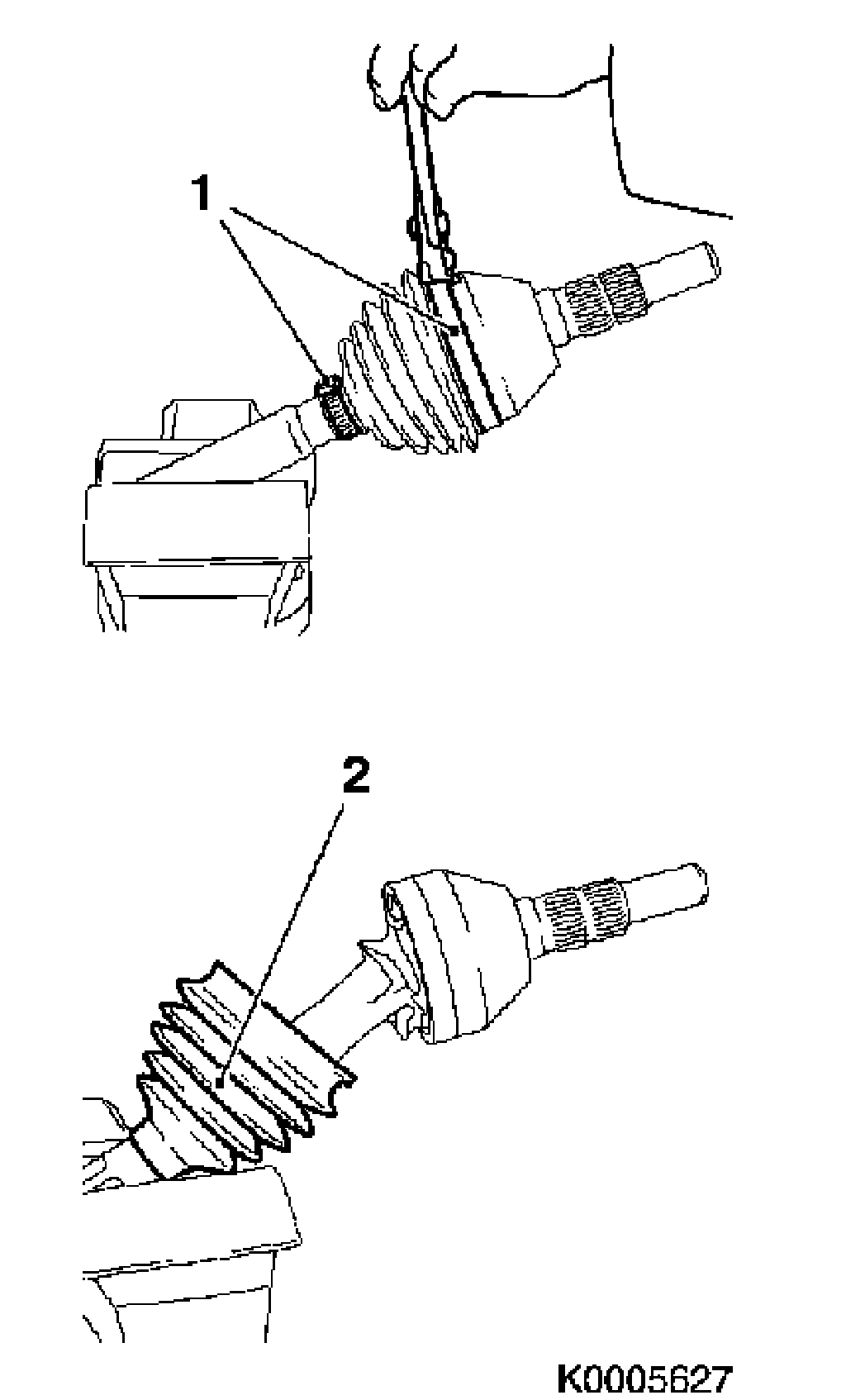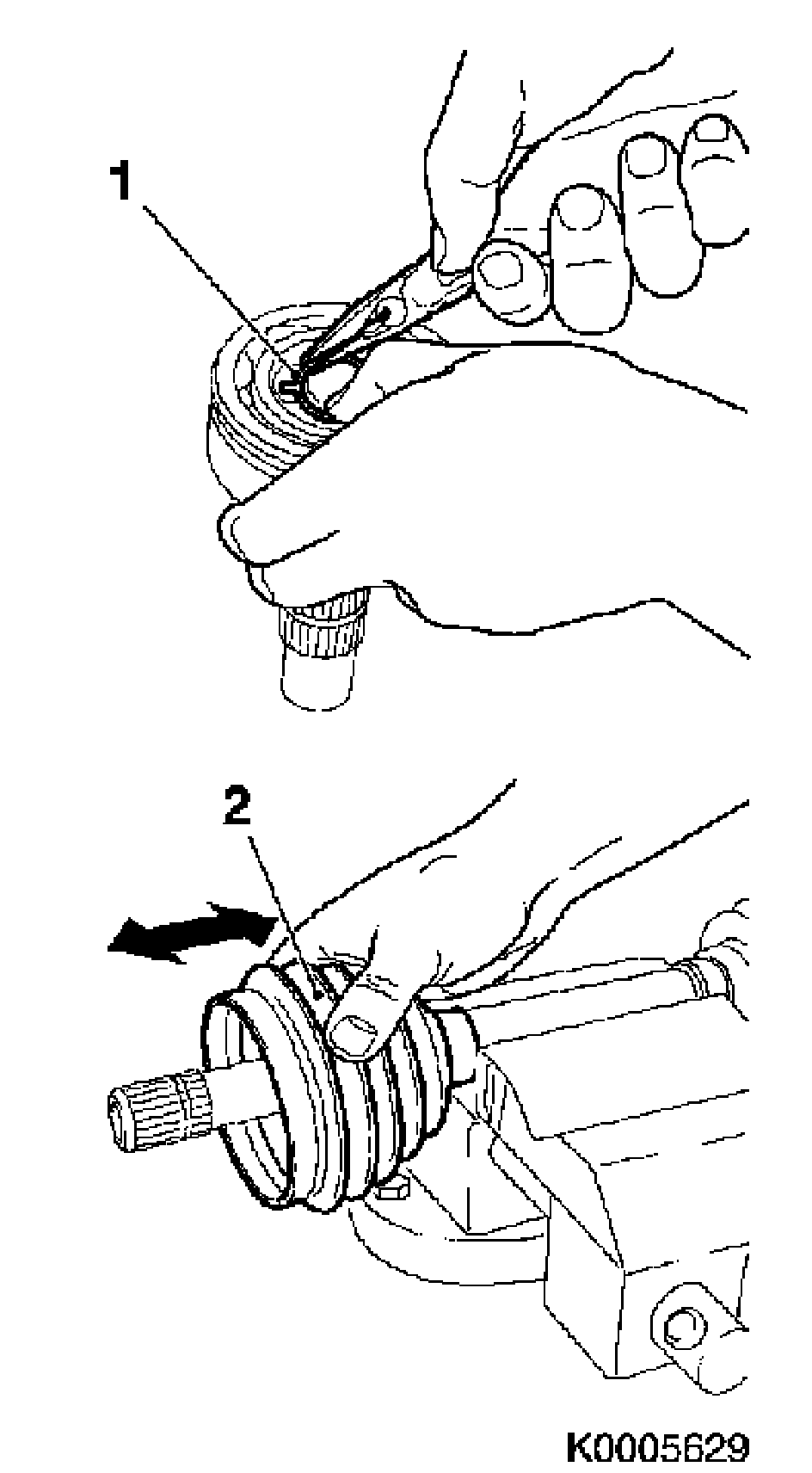 10. Slide a new rubber gaiter (2) with new clip on the drive shaft.