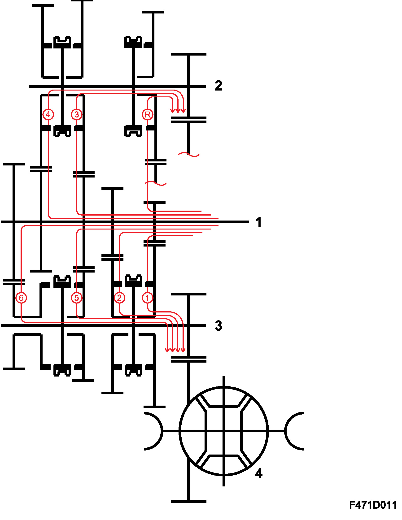Power transmission, 1st gear: When the car is driven in 1st gear, power is transmitted via the 1st gear pinion, fixed on the input shaft, to output shaft no. 1 when the last gear wheel is locked to the output shaft no. 1, on which it is journalled, by the 1st/2nd synchromesh sleeve.