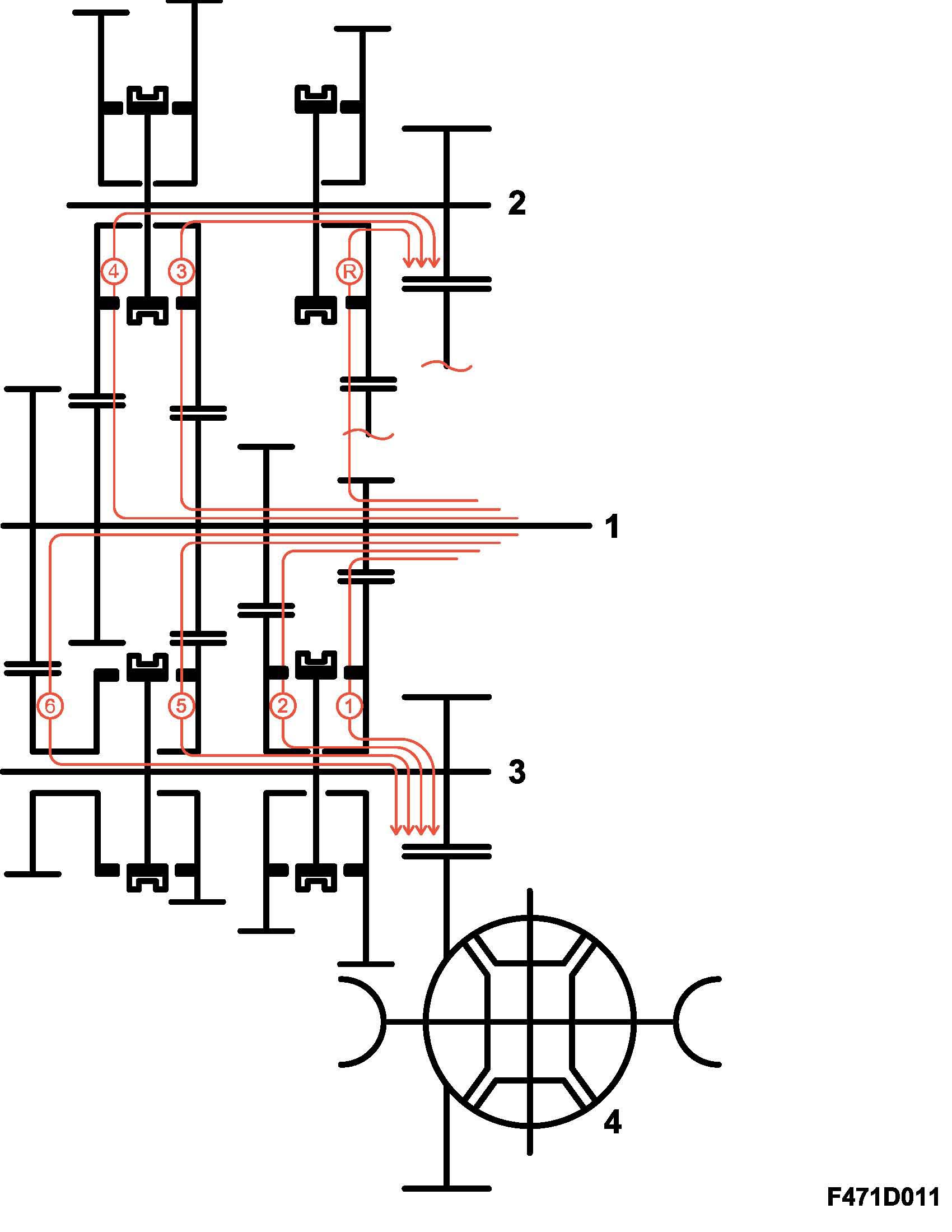 Power transmission, 1st gear: When the car is driven in 1st gear, power is transmitted via the 1st gear pinion, fixed on the input shaft, to output shaft no. 1 when the 1st gear wheel is locked to the output shaft no. 1, on which it is journalled, by the 1st/2nd synchromesh sleeve.