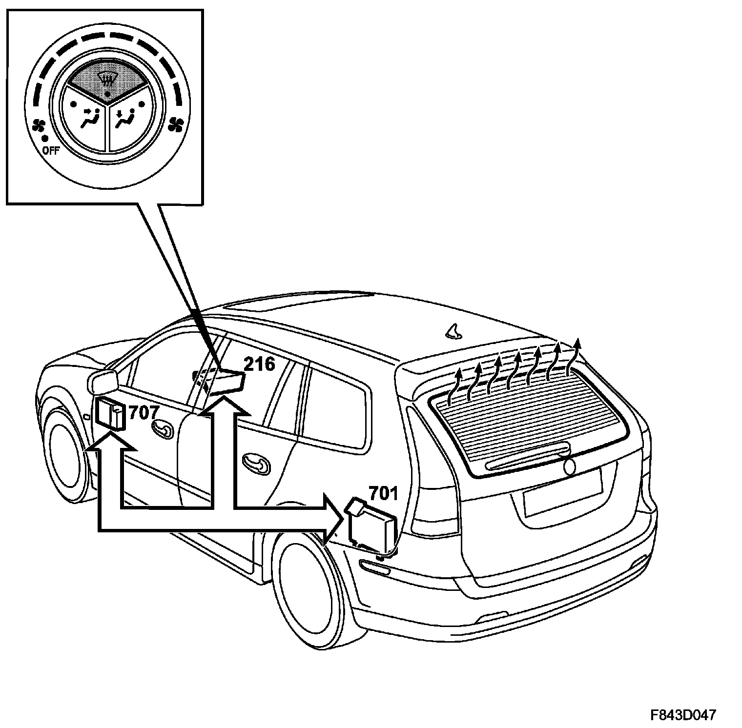 The heated rear window is activated manually by pressing a button on the ACC panel or automatically by the ACC. The heated rear window and door mirrors are activated provided the car's engine is running (s as not to discharge the battery). The rear window is normally heated for 12 minutes via current passing through its heating wires. The rear window is then heated by current passing through the antenna amplifier being led back to the rear window heating wires and being grounded via an antenna filter. The heating wires are used as an antenna for the audio system.