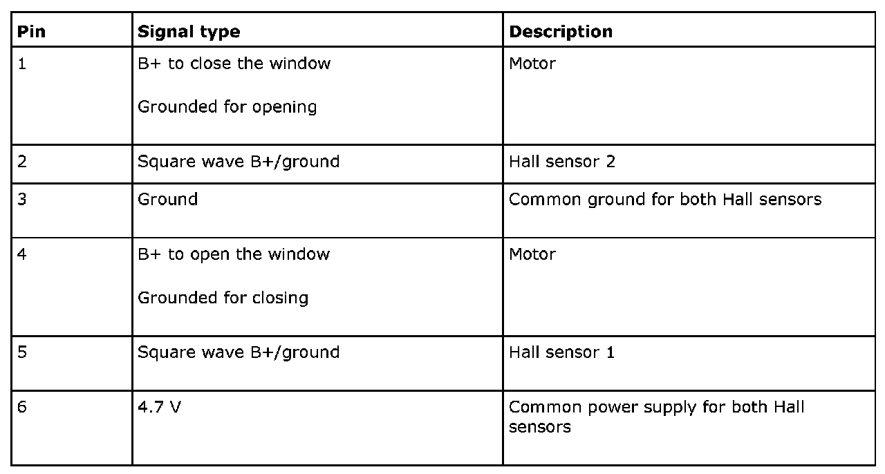 The control module inputs are digital. A voltage greater than 2 V is regarded as "OFF" and lower than 2 V as "ON". The control module calculates the position of the window by counting the number of changes between "ON" and OFF". The control module will count 2 changes per revolution of the motor from each Hall sensor. Since the sensors are displaced by 90 degrees, the control module will detect a total of 4 changes, displaced by 90 degrees, each revolution.