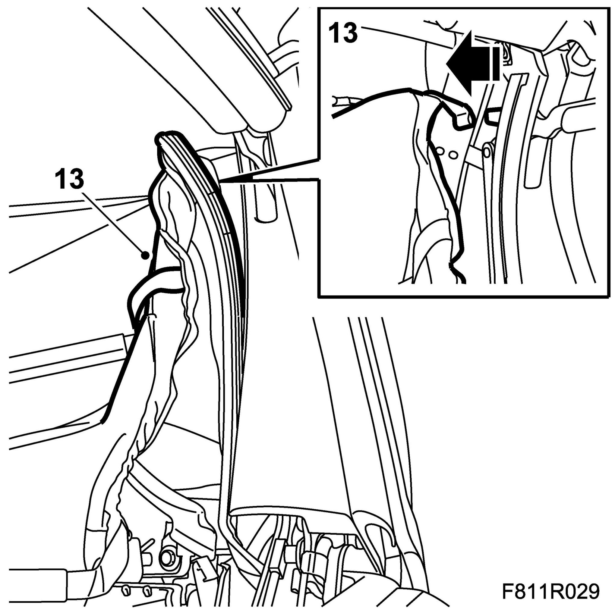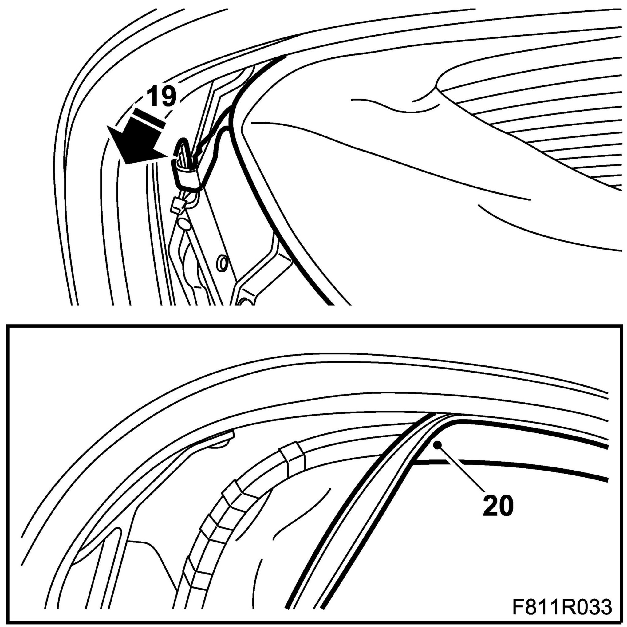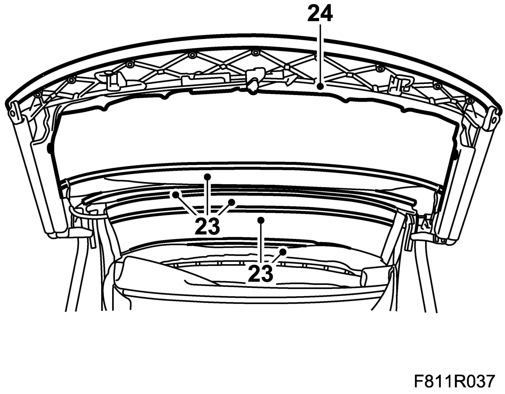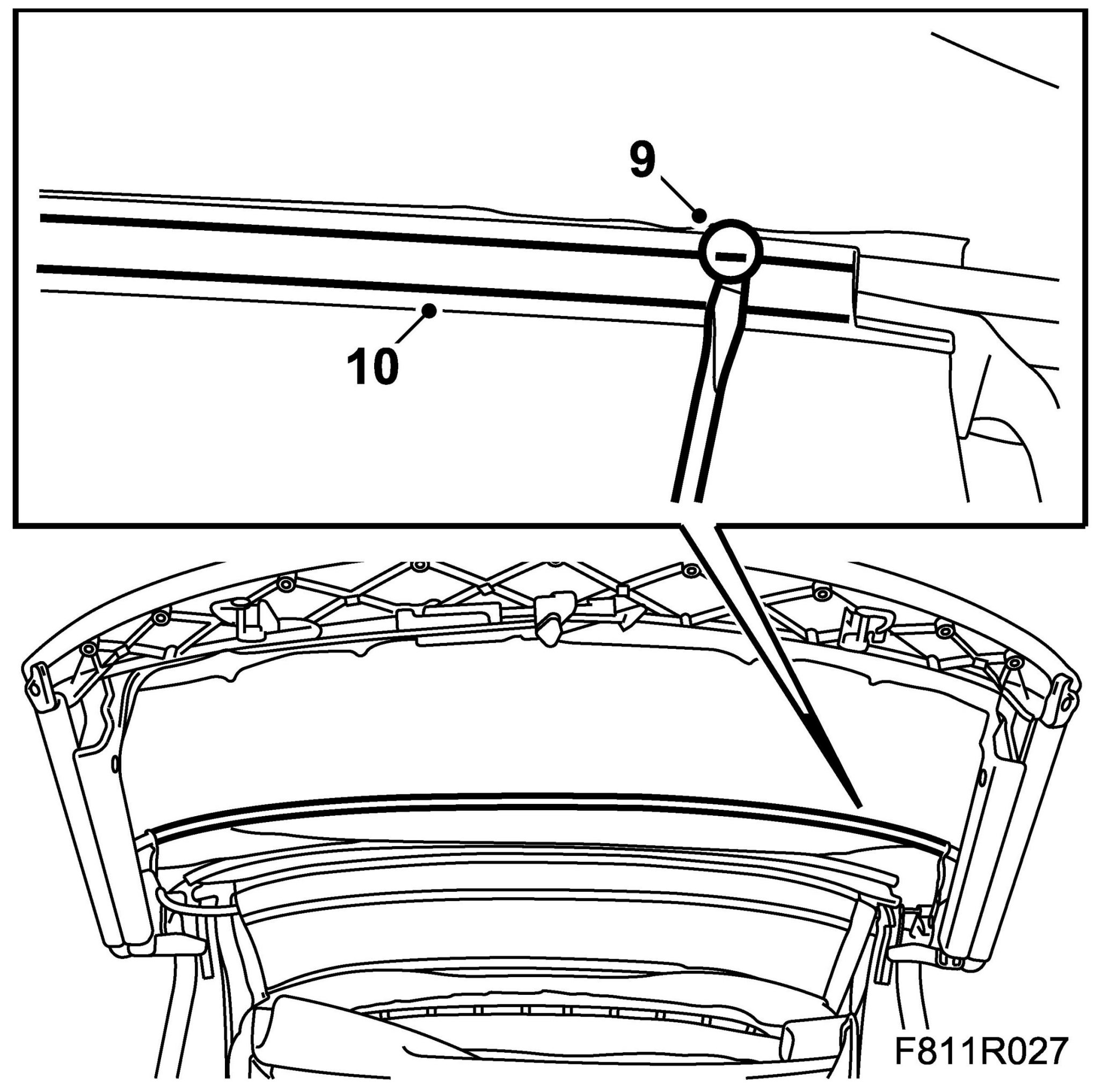 29. Fit the headlining to the rear rails by pressing in the headlining rail.