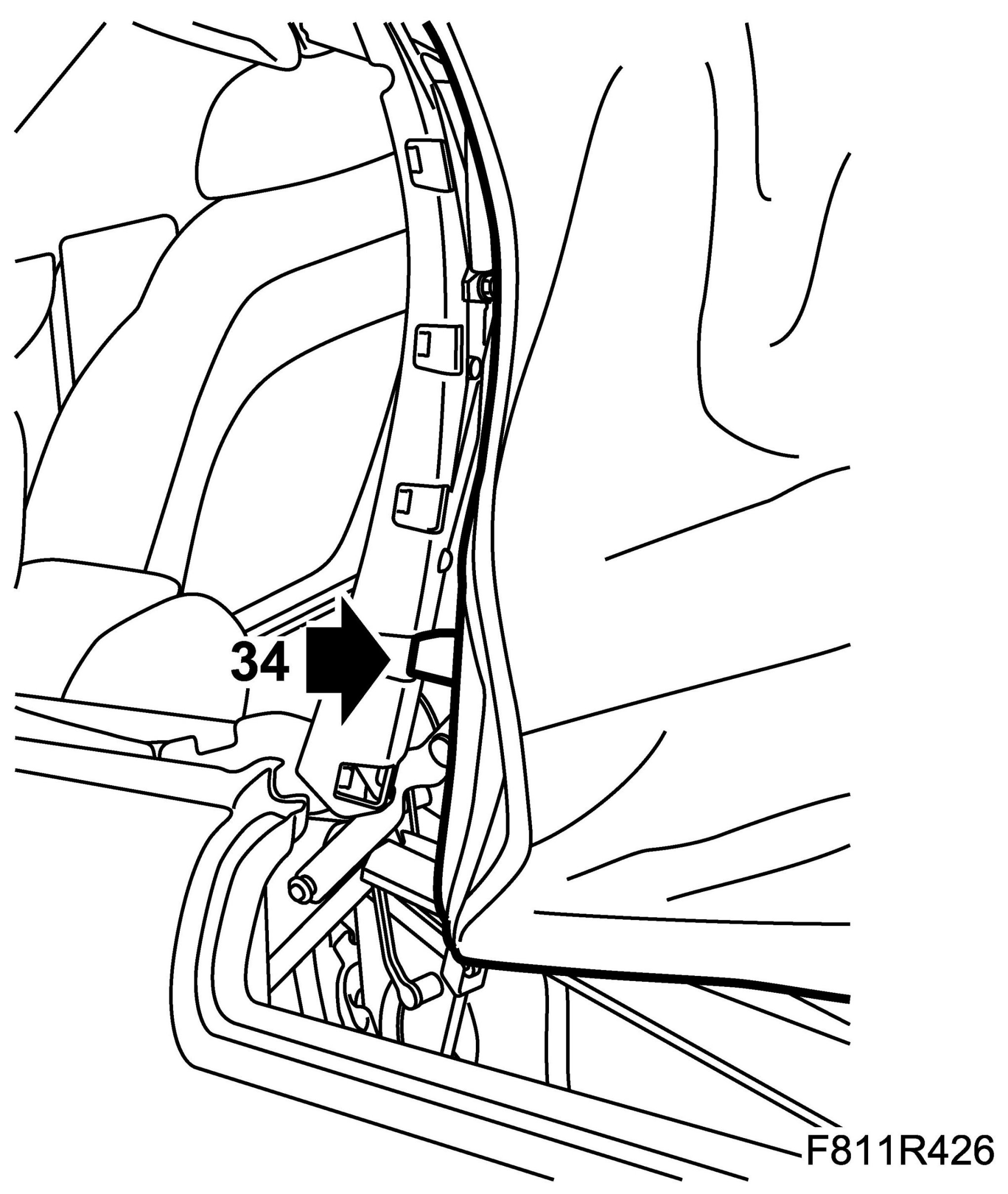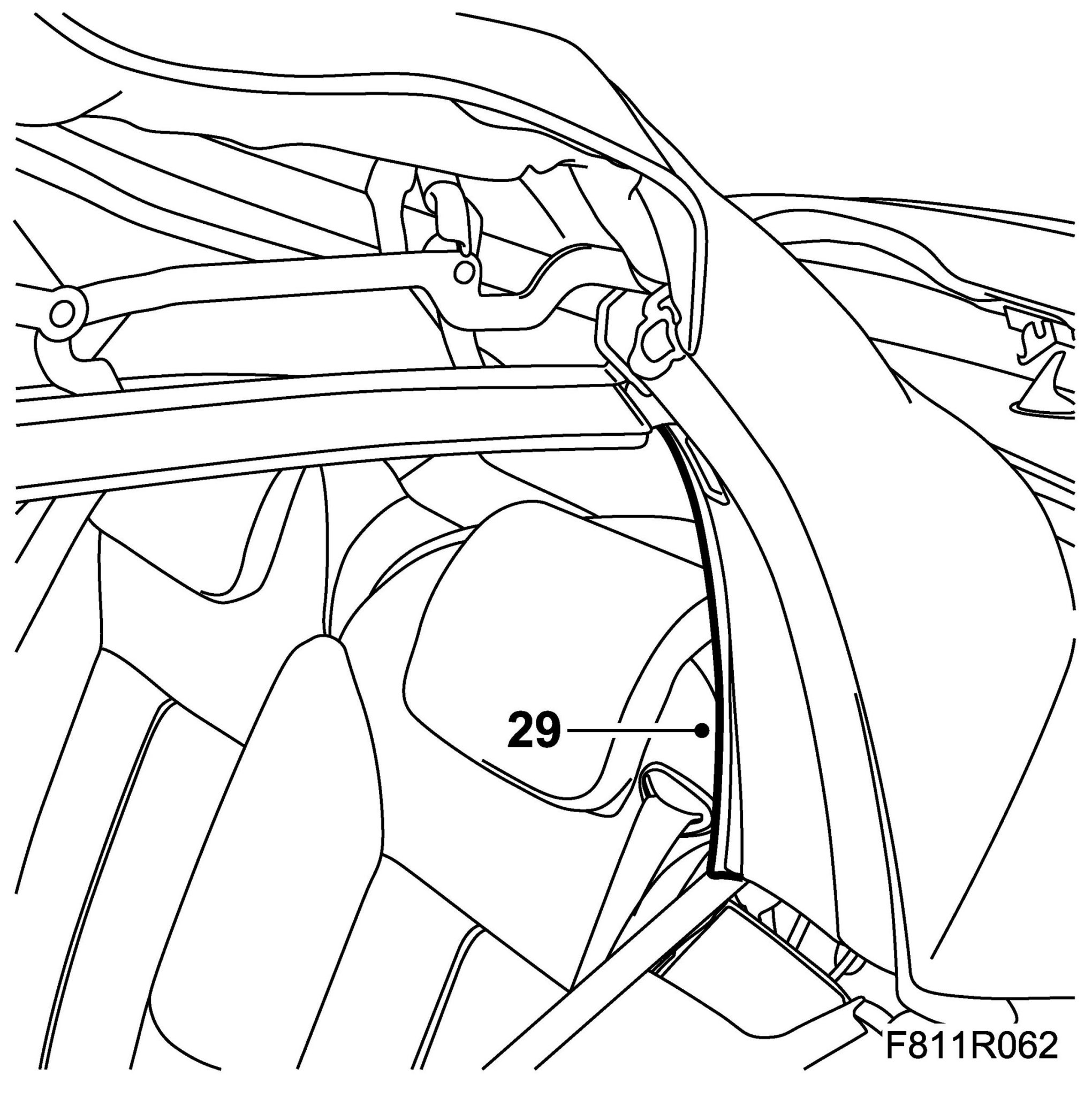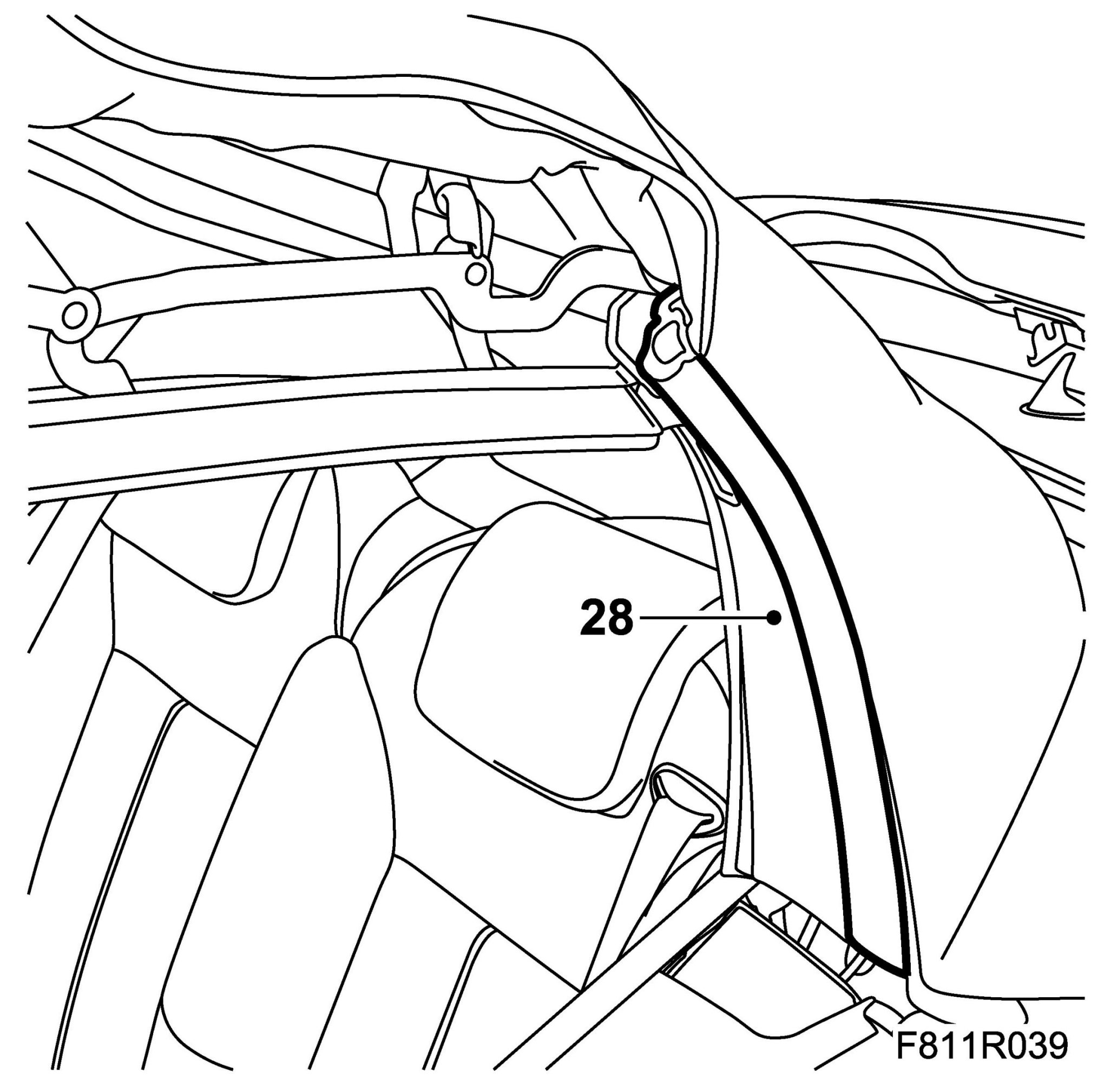 28. Fit the headlining rubber strap to the hook on the rear rail.