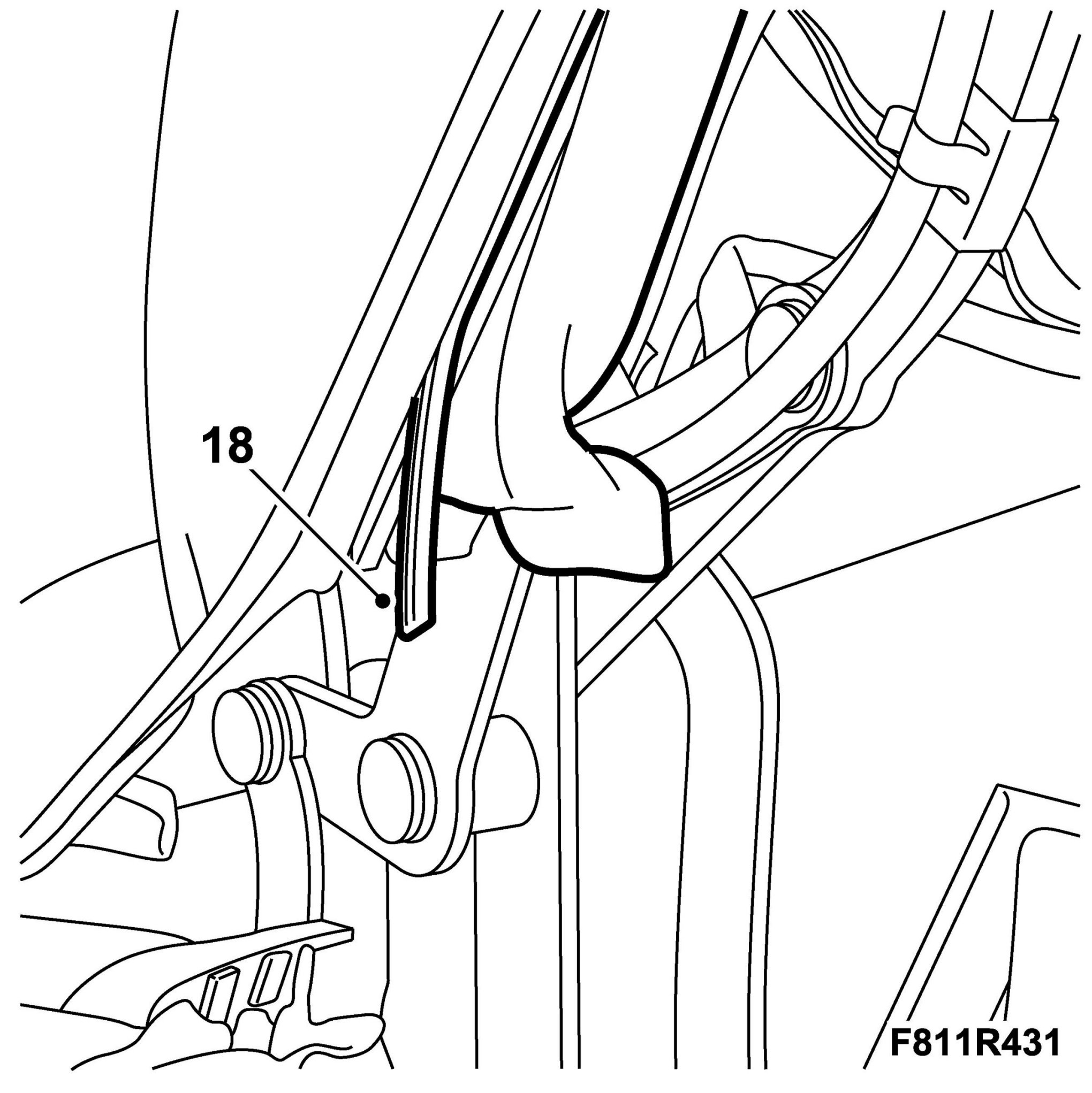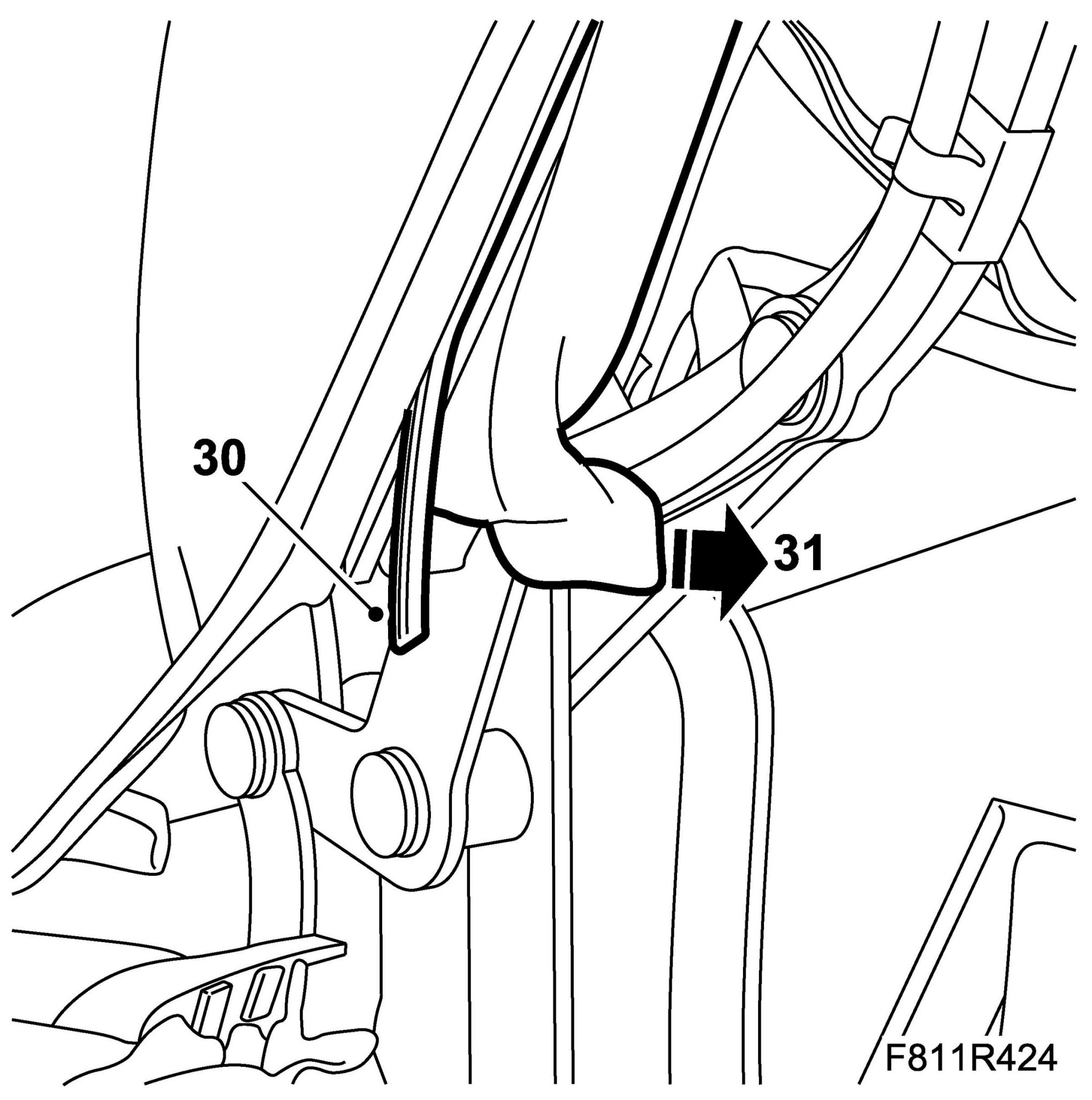 9. Fit the Velcro fastener to the linkage system for the front rail. The Velcro fastener must be in front of the hose package.