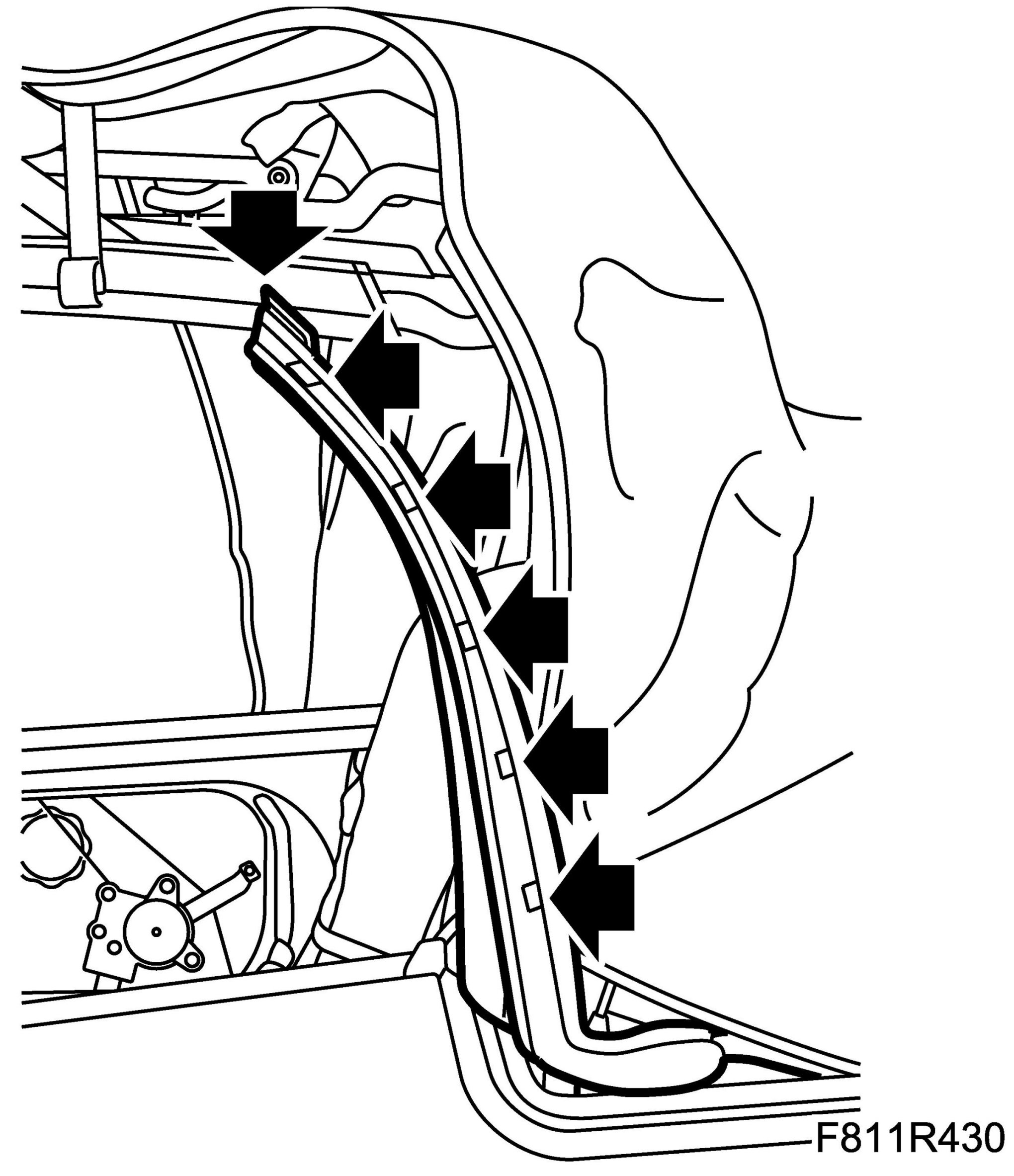 28. Remove the rear rail seals. Remove the seal by pulling it out of the middle of the U-shaped rail. Unhook the top part of the seal from its mounting. Leave the seal hanging.