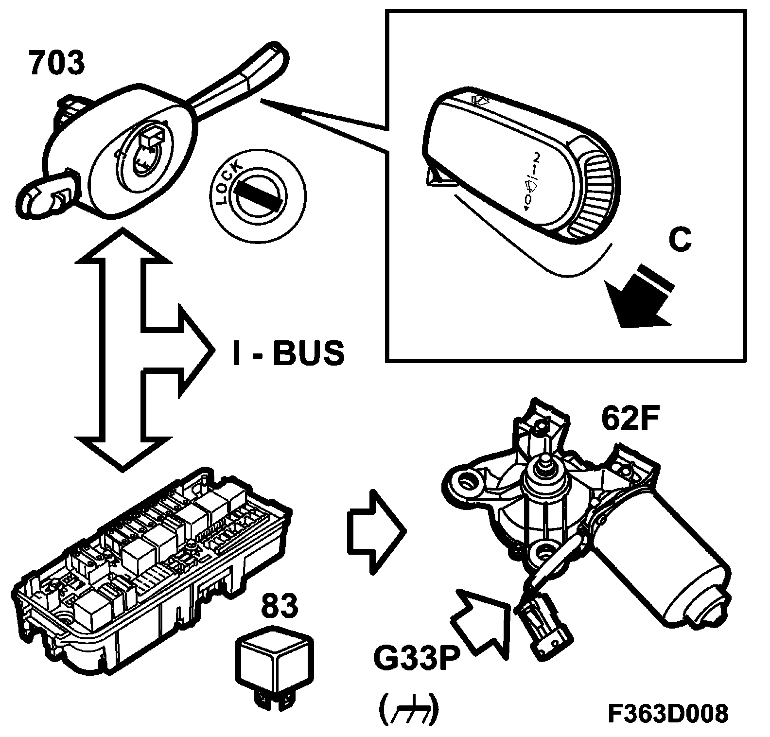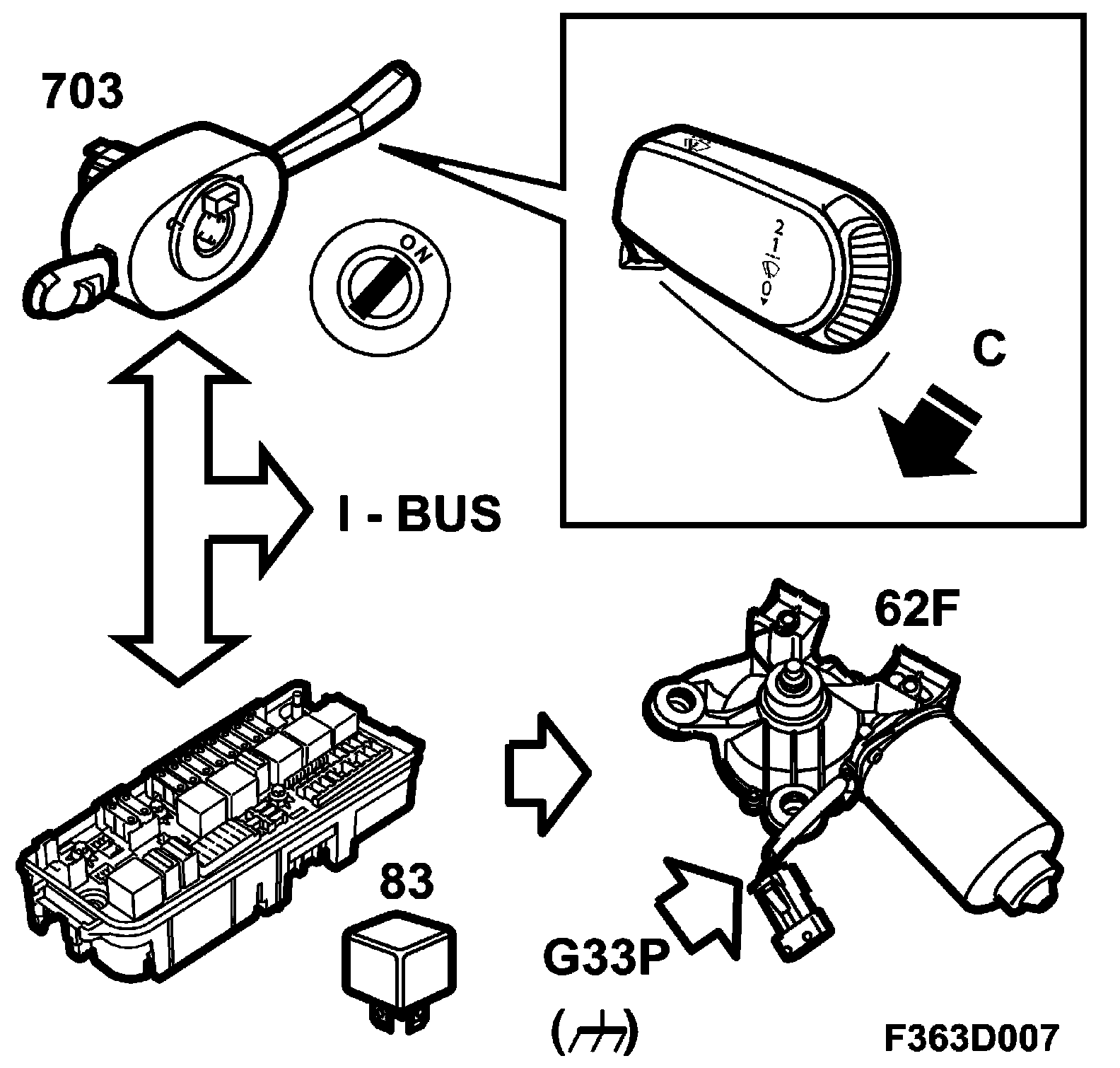 The wiper stalk-switch (61) is integrated with the CIM (703). The CIM transmits a message on the bus giving the position of the stalk-switch. Windscreen wiping is only possible when the ignition switch is in either the OFF or the ON position.