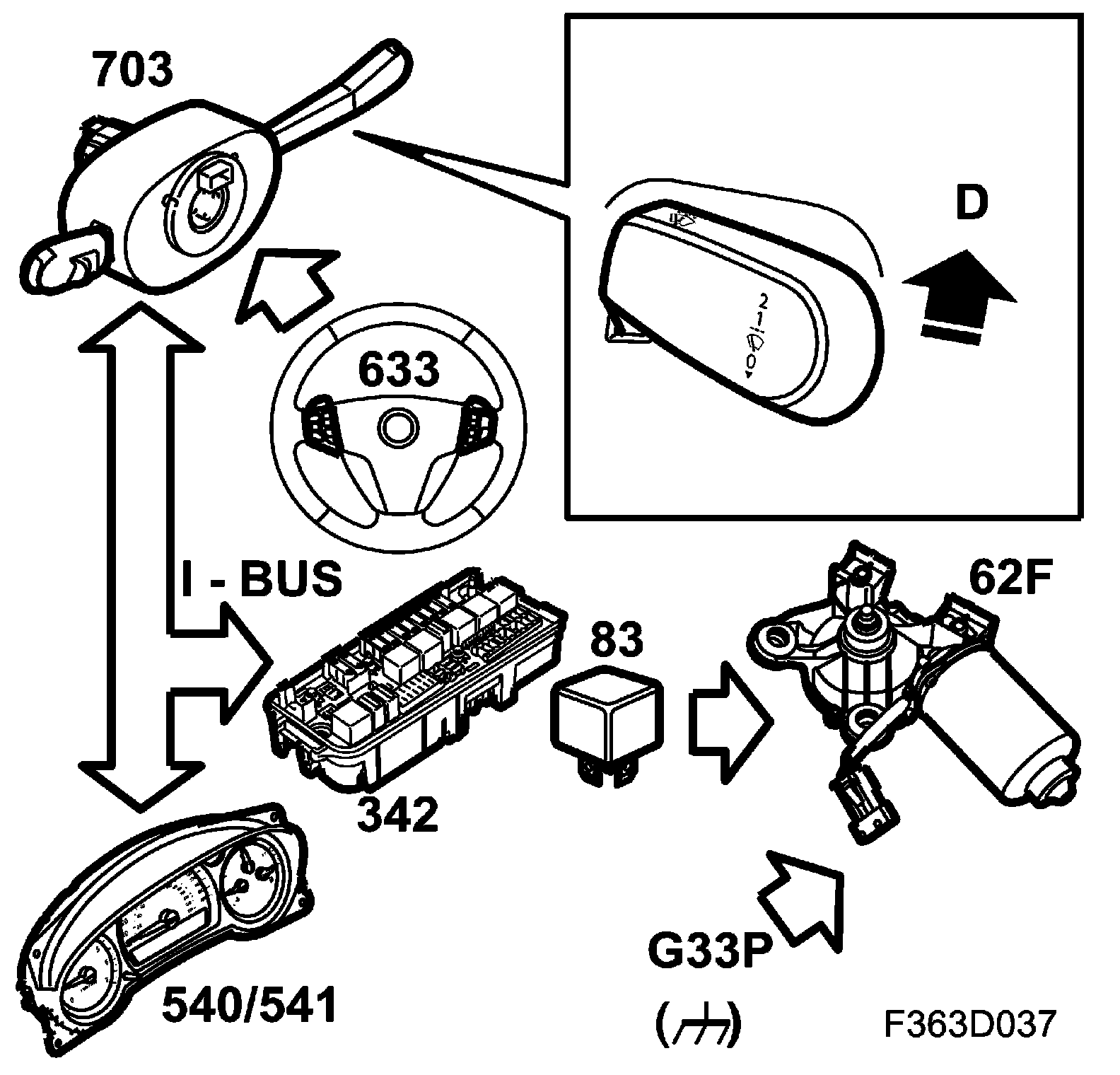 When the windscreen wiper stalk-switch is moved to the spring-loaded, single stroke position, the CIM (703) transmits the bus message "Windscreen wiper, stalk-switch, SPRING-LOADED POSITION", on condition that the ignition is ON. The message is processed by the UEC (342) which activates relay 83 and the wiper motor (62 F) is connected to the voltage supply. The UEC (342) supplies B+ on pin 30(F) which is connected to pin 4 on the wiper motor (62 F). Pin 3 on the wiper motor is connected to ground.