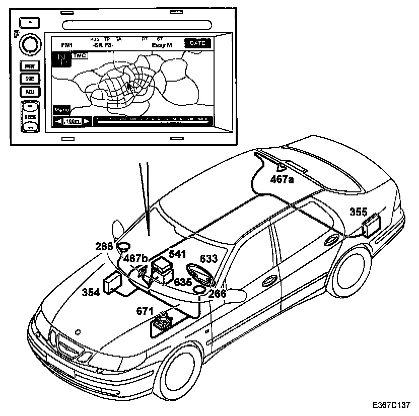 The audio/navigation system head unit is located in the dashboard. The unit contains a DVD player, GPS receiver with gyro, and touchscreen.