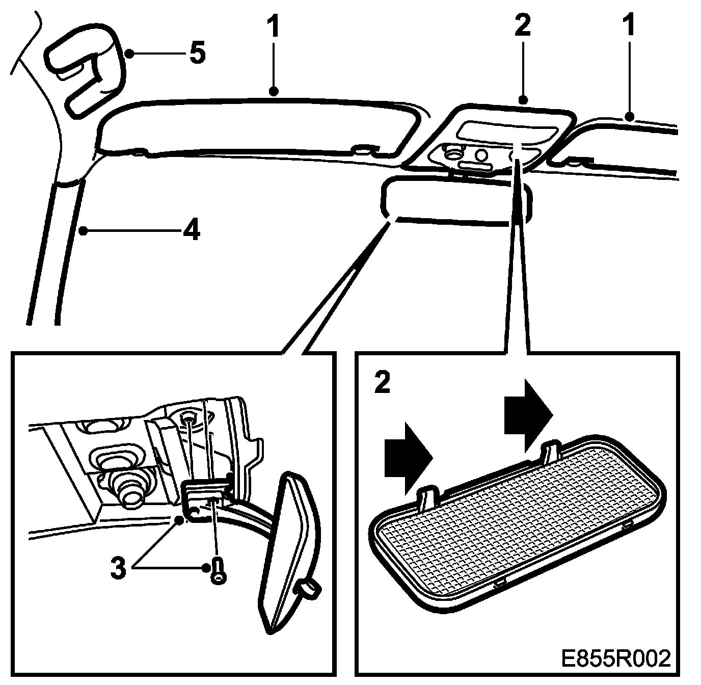 1. Remove the sun visor and its mounting, 3 screws per visor.