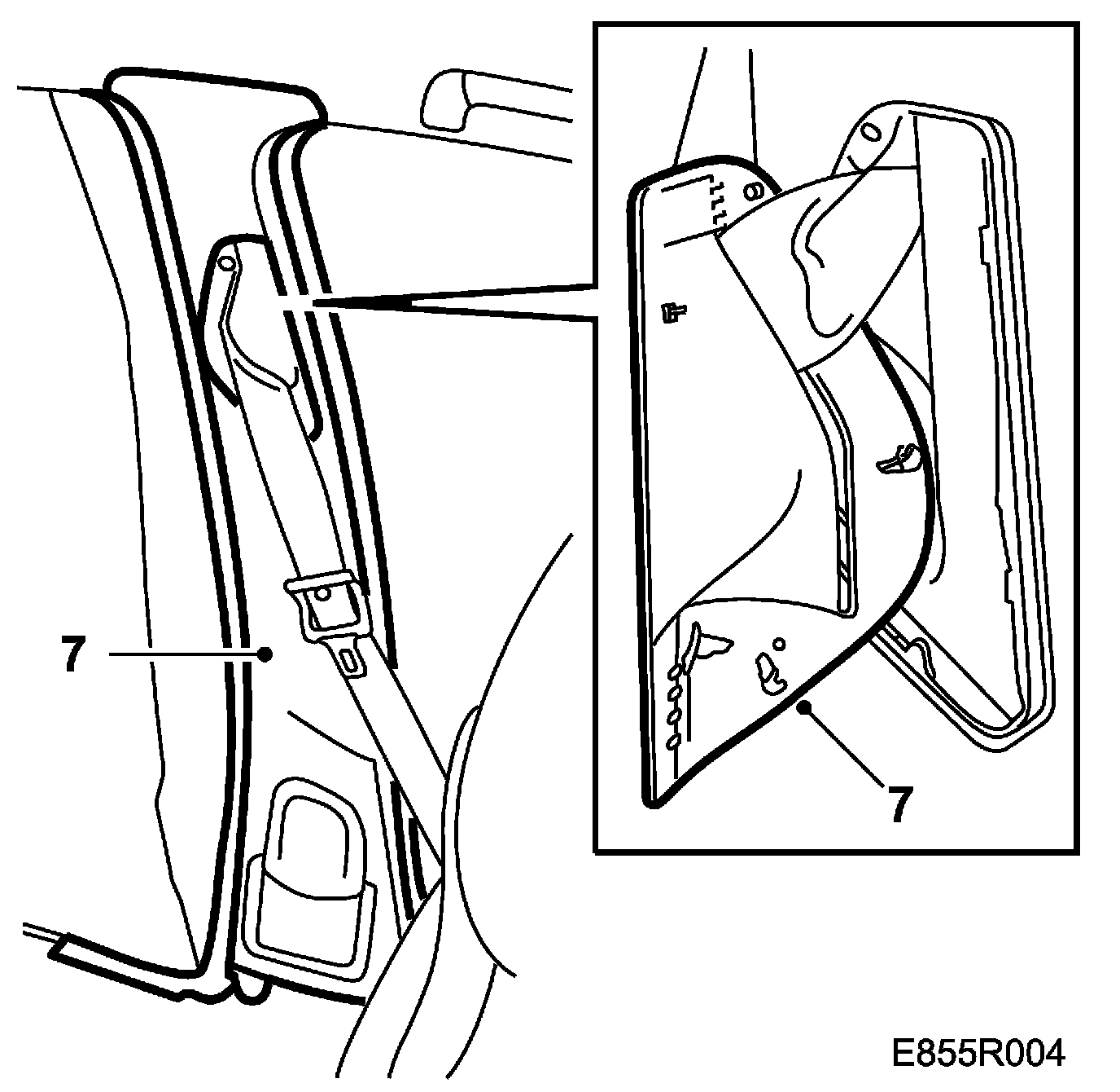 4. Fit the headlining to the B-pillar trim and door sealing mouldings on the driver's side.
