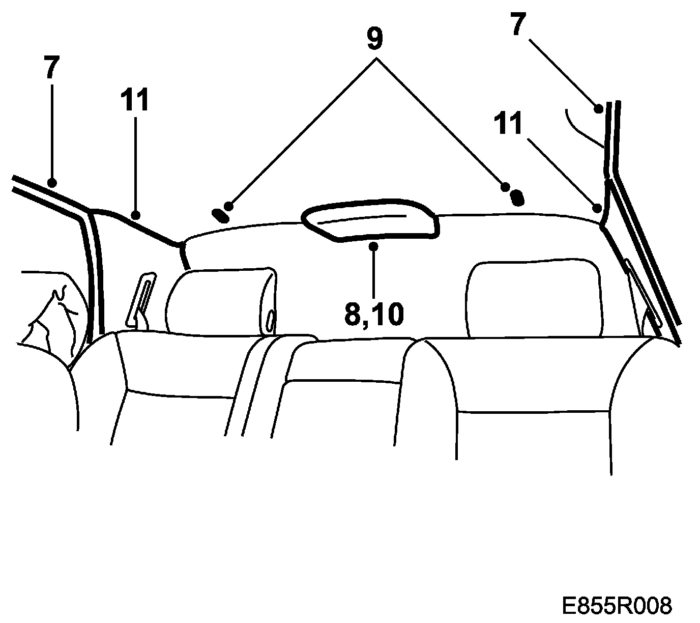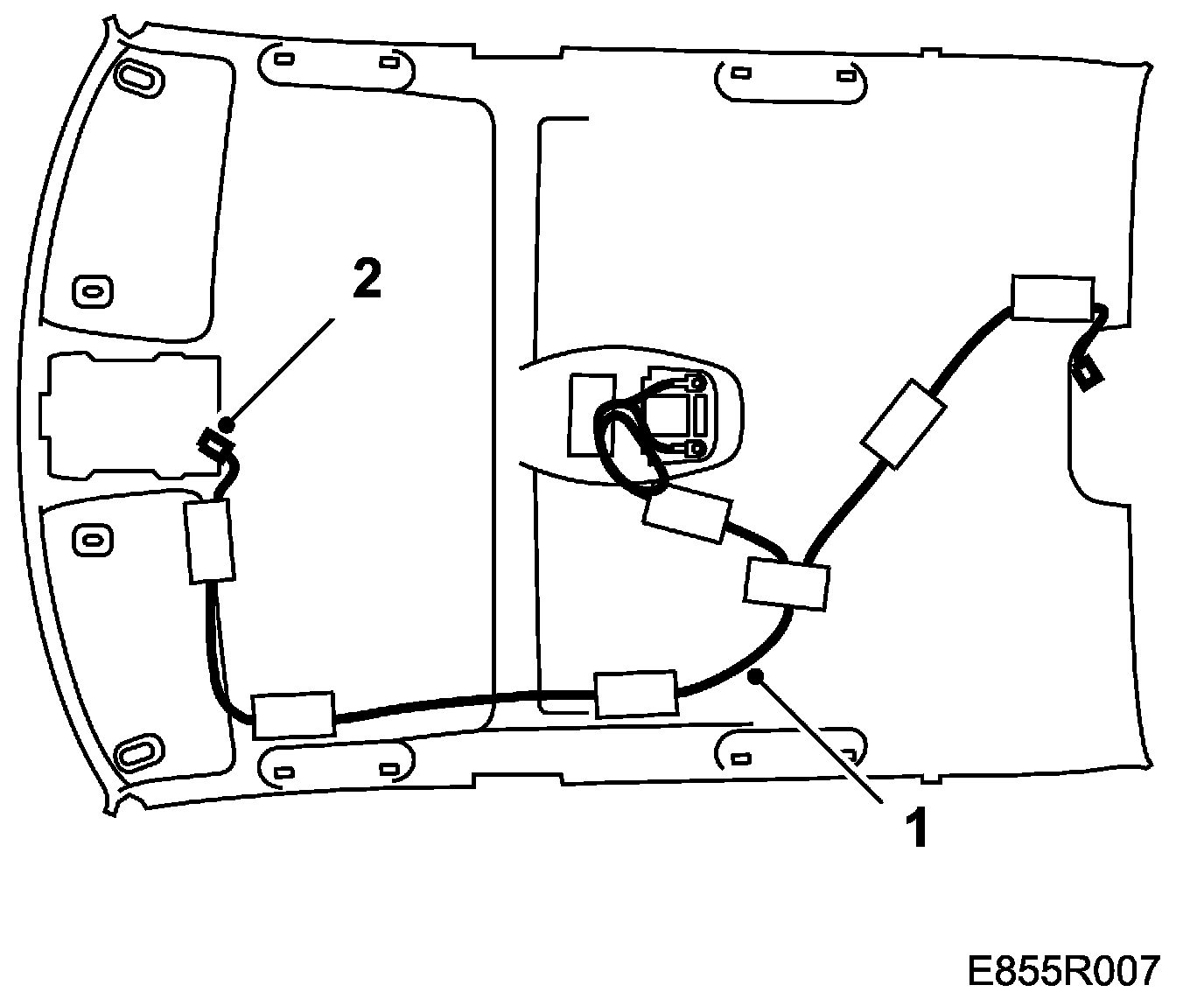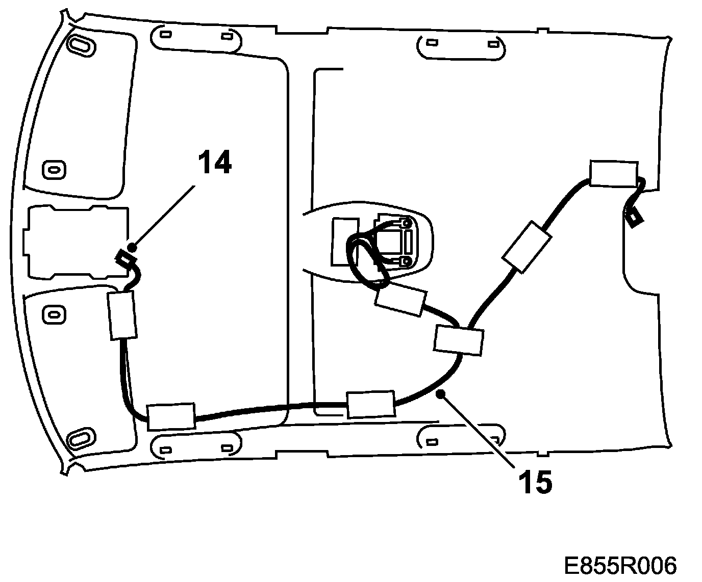 1. When replacing the headlining, the rear roof light and wiring harness should be fitted.