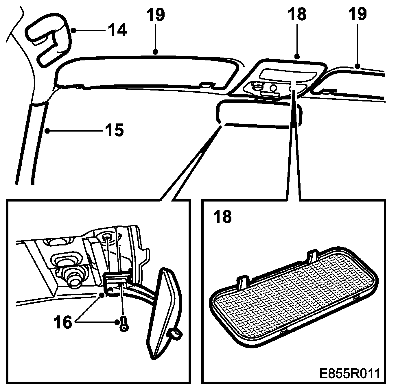 16. Refit the rear-view mirror, 3 screws.