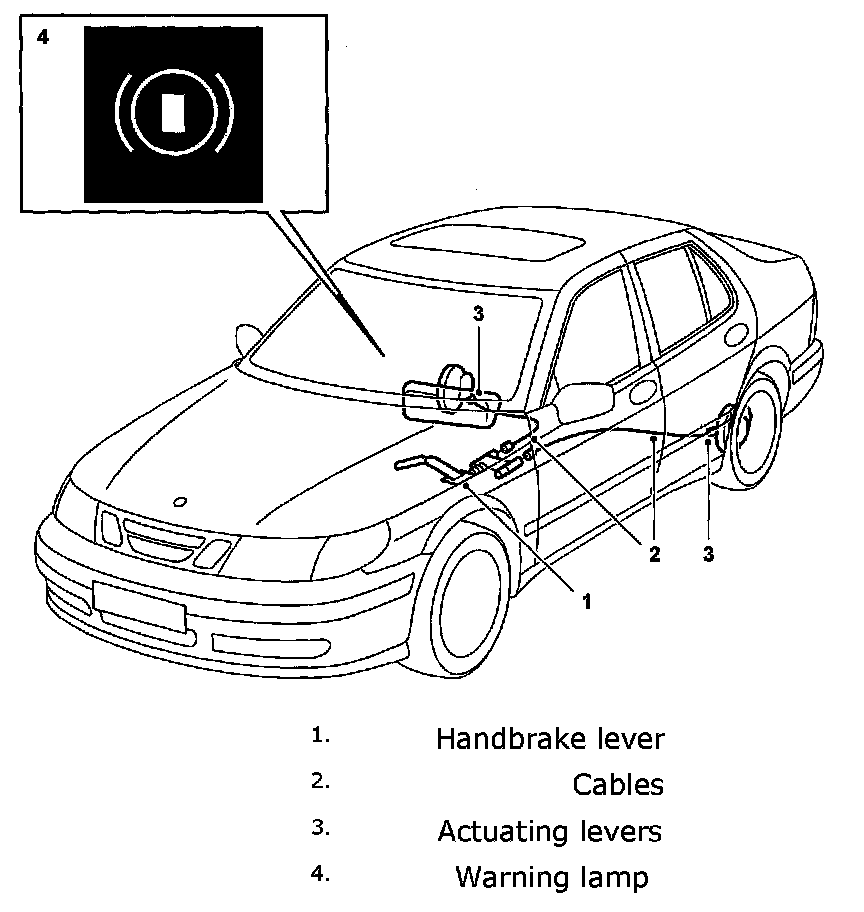 System overviewThe Handbrake system is operated by a lever (1) and acts mechanically on the rear wheels.