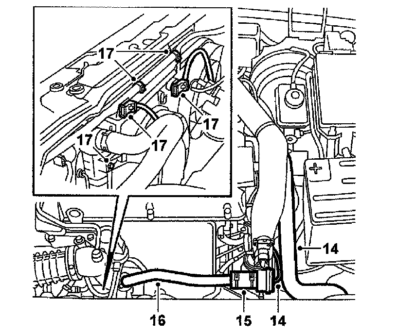 14. Disconnect the upper radiator hose and remove the bypass valve's vacuum hose.